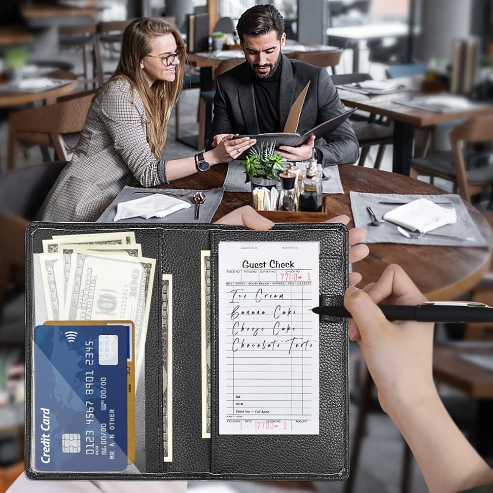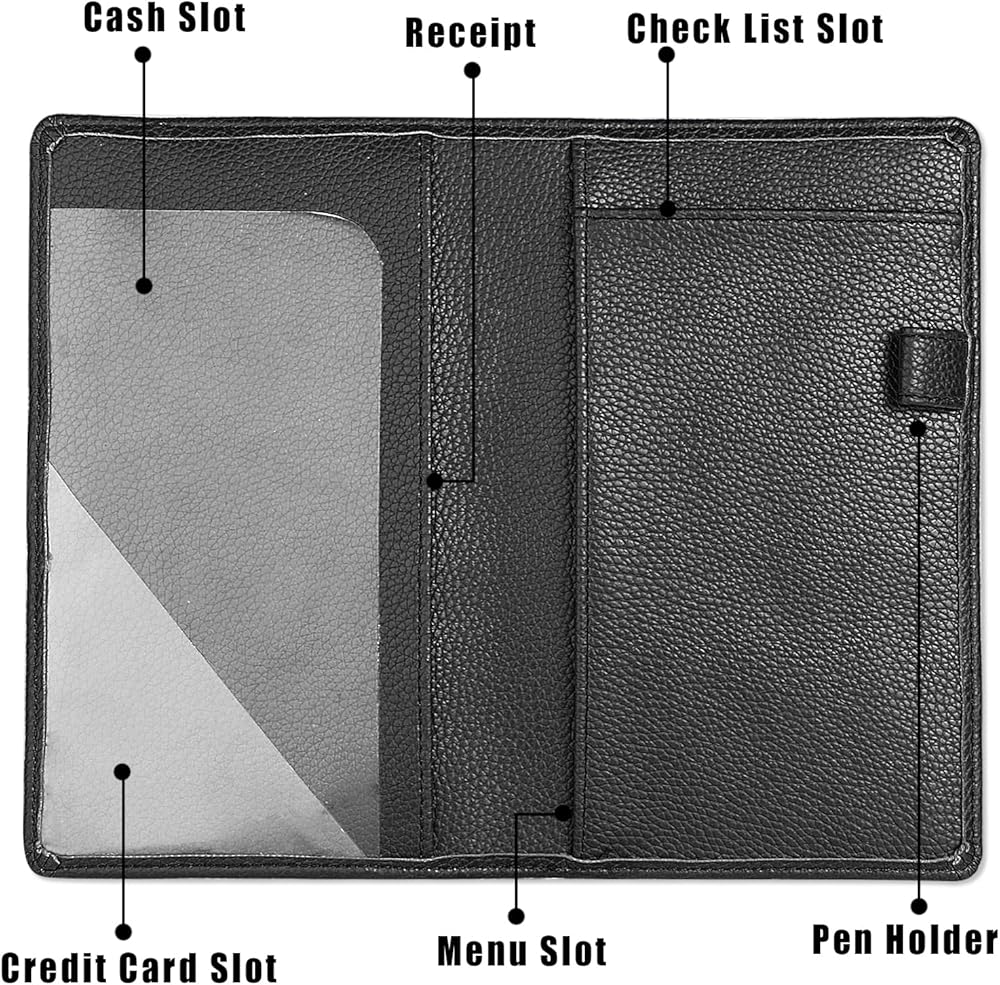 سعة كبيرة: يحتوي منظم كتب الخادم للنادلة والنادل على 5 جيوب عملية وفتحة قلم واحدة، مما يجعله مثاليًا لتنظيم شيكات الضيوف وبطاقات العمل والتذاكر والنقود والعملات المعدنية والإيصالات والفواتير والنصائح وما إلى ذلك. مقصورتان شفافتان مناسبتان تخزين قوائم المراجع السريعة.