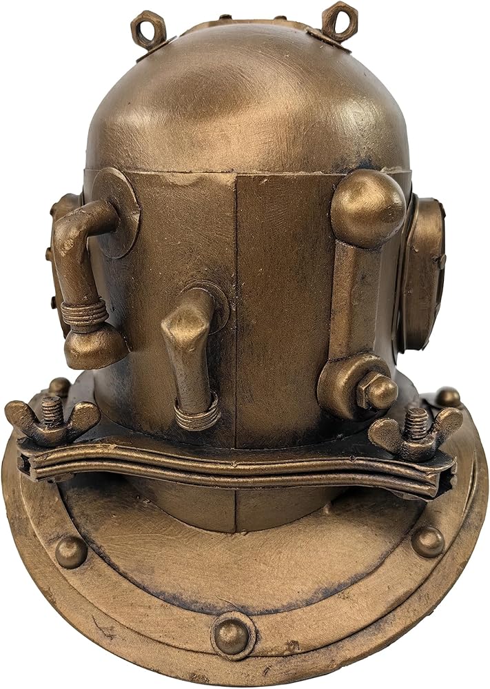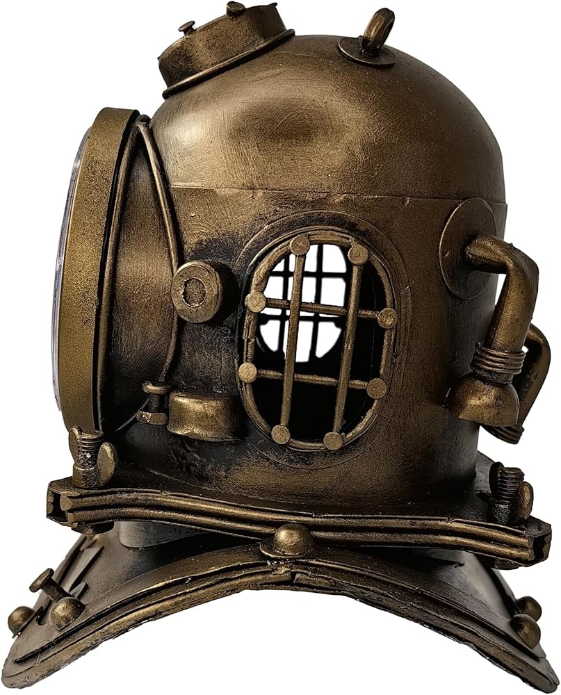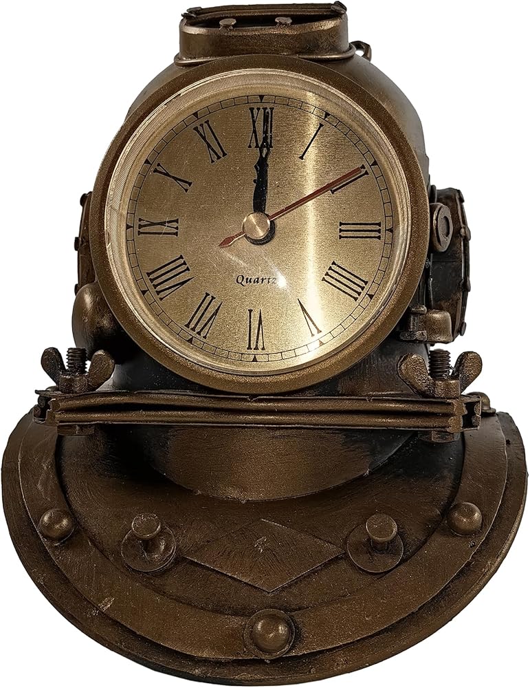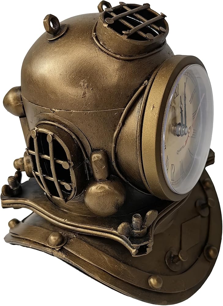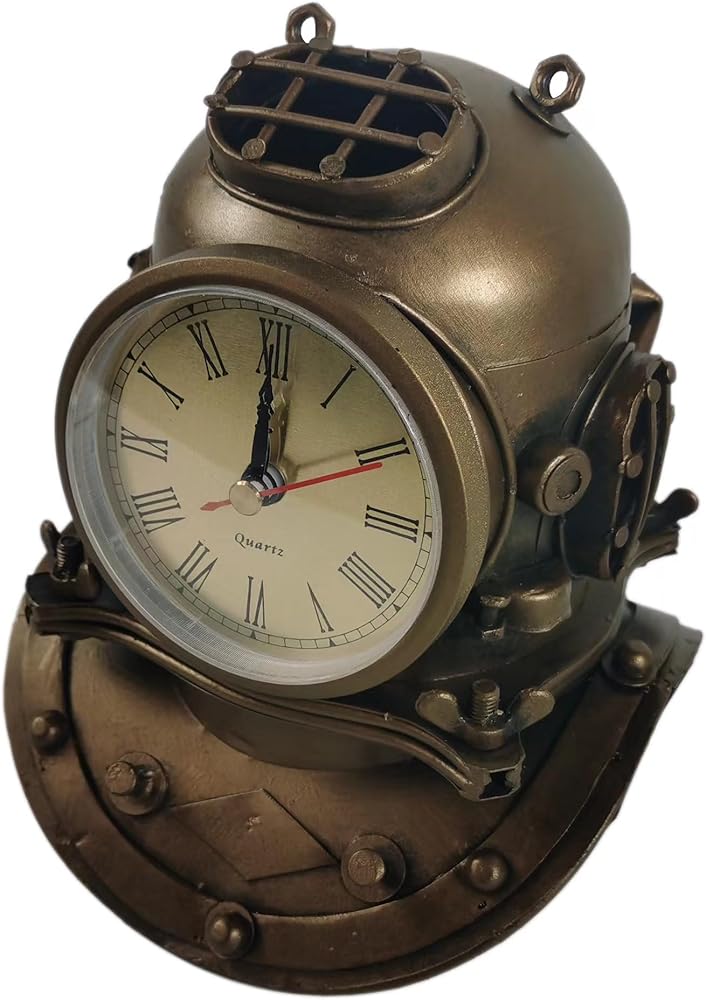 This unique metal diving cap style art desk stand clock is a creative and decorative addition to any home or office decor. It is made of high quality bronze metal and features a non ticking battery operation, making it a quiet and reliable timepiece. The clock has a classic diving cap design with a clear glass cover, and the clock hands are easy to read. The clock is perfect for use as a desk clock, shelf clock, or nightstand clock, and is a great gift for friends, family, or colleagues. It is also a great conversation starter and a perfect addition to any vintage or industrial decor.