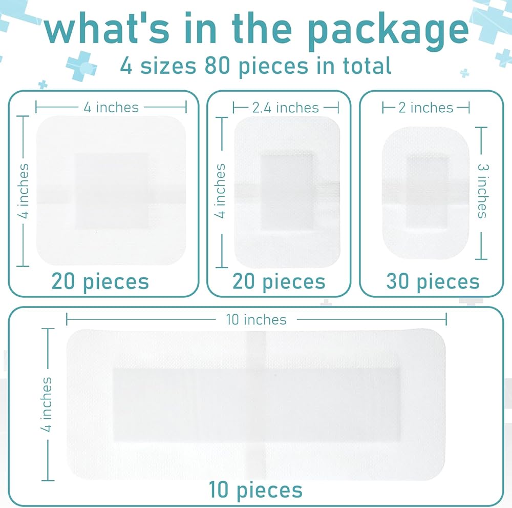 80 قطعة من ضمادات الشاش ذات الحدود لجزيرة الشاش، 2 × 3 بوصة، 2.4 × 4 بوصة، 4 × 4 بوصة، 4 × 10 بوصة، ضمادات ملفوفة بشكل فردي مع حدود لاصقة قابلة للتنفس