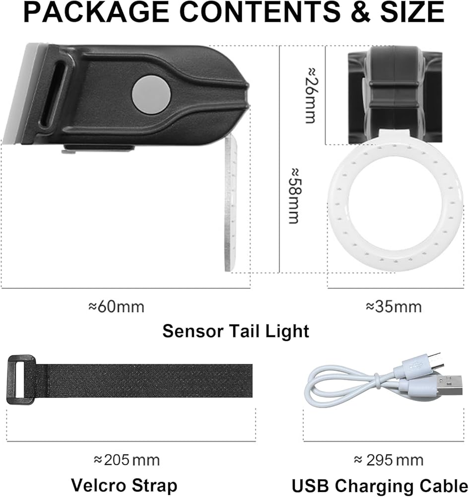 [قابل لإعادة الشحن عبر USB] يحتوي مصباح ذيل الدراجة LED على بطارية مدمجة قابلة لإعادة الشحن بقدرة 300 مللي أمبير في الساعة. يأتي مع كابل شحن للشحن من الكمبيوتر أو البطارية أو أي جهاز مزود بمنفذ USB.
