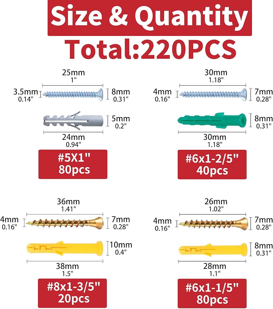 ✔【ITEM SIZE】: The drywall anchors and screws kit includes 110 plastic wall anchors & 110 philips screws, 4 sizes - #6x1-1/5" #6x1-2/5" #5x1" #8x1-3/5". This set of expansion tools in multiple sizes can help you do almost all the work of daily wall hangings.