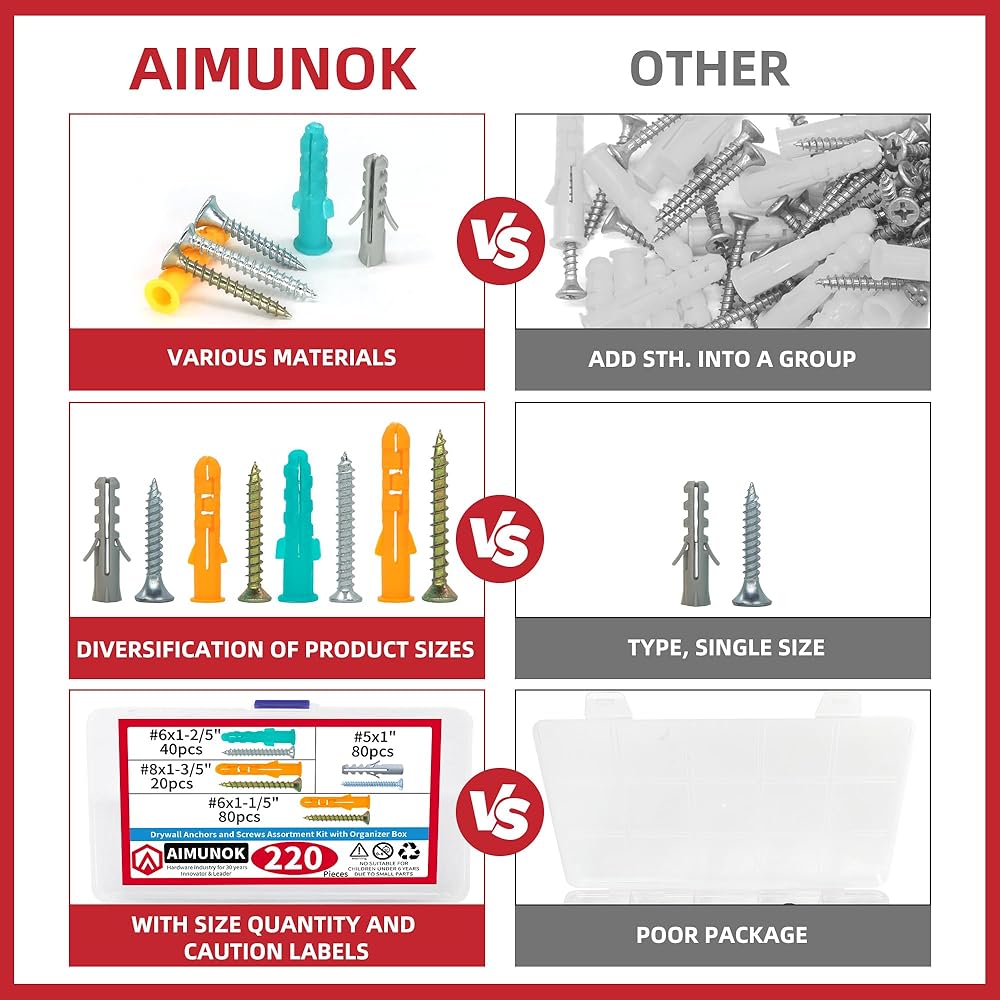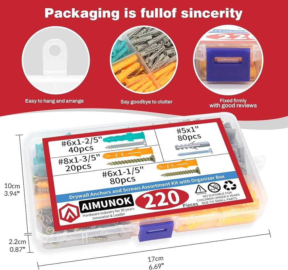 【AIMUNOK 220PCS Drywall Anchors and Screws Kit, 110 Plastic Dry Wall Anchors & 110 Philips Flat Head Screws, 4 Sizes Wall Mount Screws and Anchor Set to Meet Different Needs.】