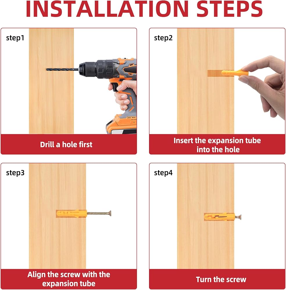 ✔【HIGH QUALITY】: All the plastic wall anchors are made of high quality brand new materials. The Wood screws are made of high carbon steel with galvanized surface, strong hardness and rust resistance. The drywall anchors are made of nylon and PE composite material to ensure high strength, abrasion resistance and aging resistance.