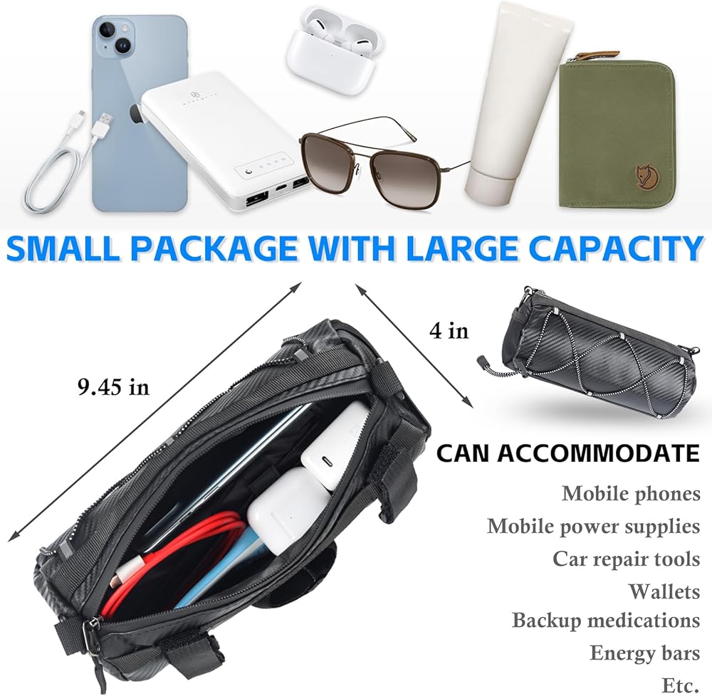【سعة كاملة】 تتميز حقيبة يد الدراجة بسعة 2 لتر، مما يوفر مساحة تخزين لهاتفك ومحفظتك ومفاتيحك ومستلزماتك اليومية. حجم حقيبة رف الدراجة هو 9.45 بوصة * 4 بوصة * 4 بوصة، مما لن يجعلك تشعر بالثقل أو الحجم الكبير، كما أنها قابلة للحمل للغاية.