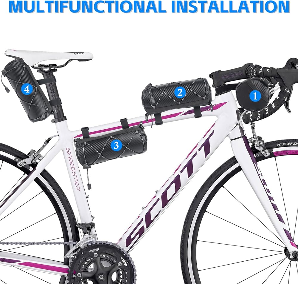 【تصميم تركيب متعدد الأوضاع】 تم تصميم حقيبة الدراجة بهيكل يمكن تركيبه في أوضاع متعددة، مما يسمح لك بحملها على ظهرك، أو تثبيتها على المقود أو المقعد أو الإطار. يحتاج ارتفاع المقعد إلى يمكن رفعها أسفل المقعد لحجز مساحة لحقيبة الدراجة.