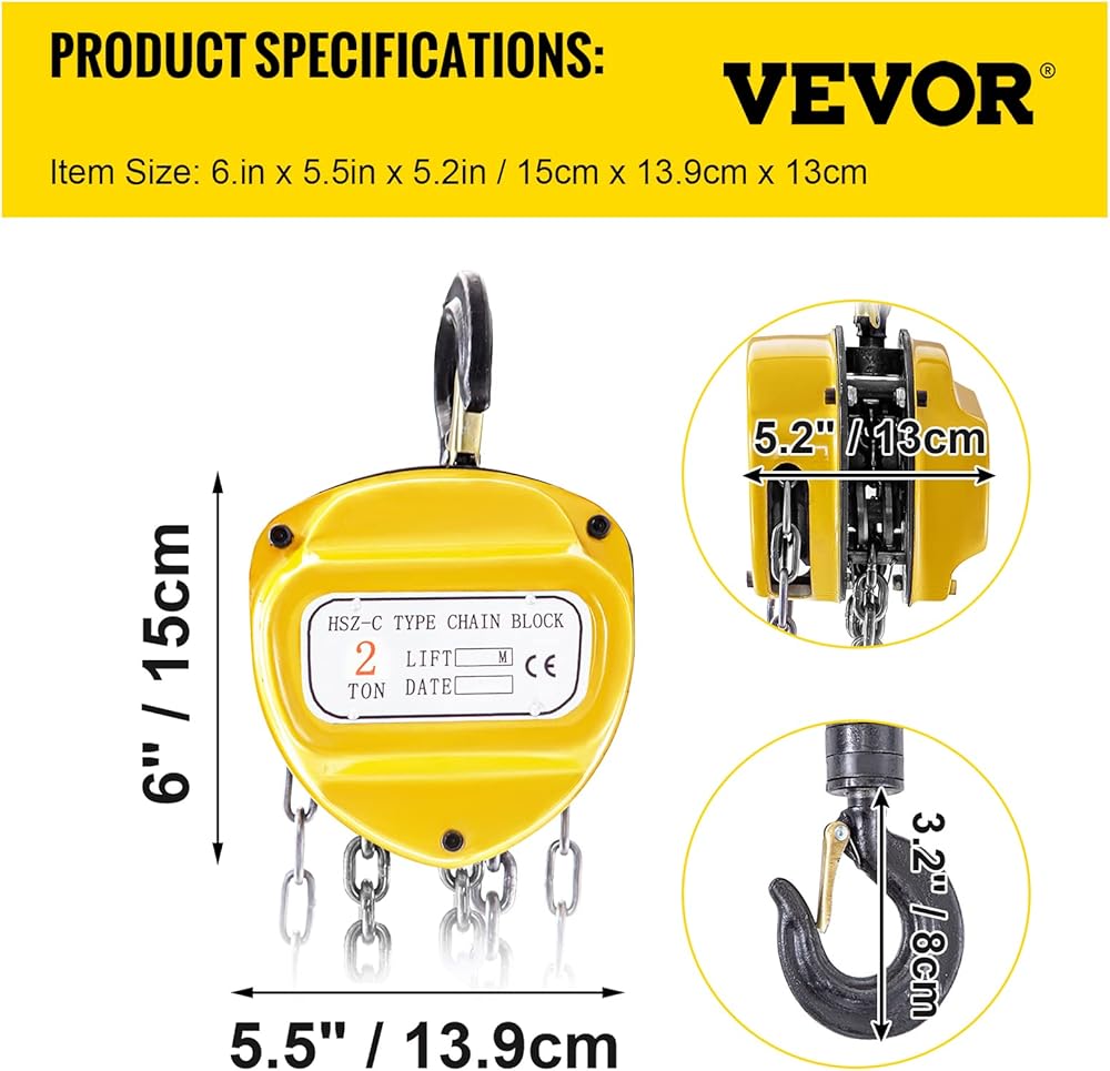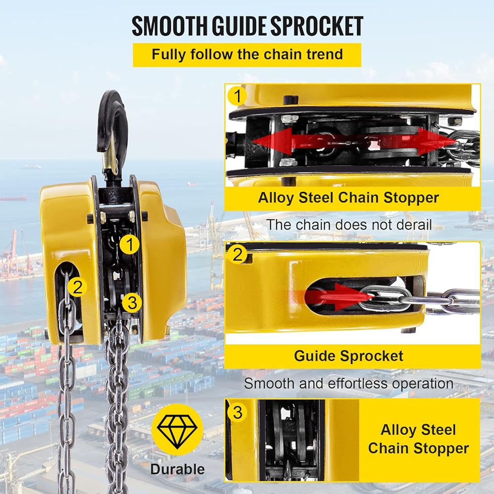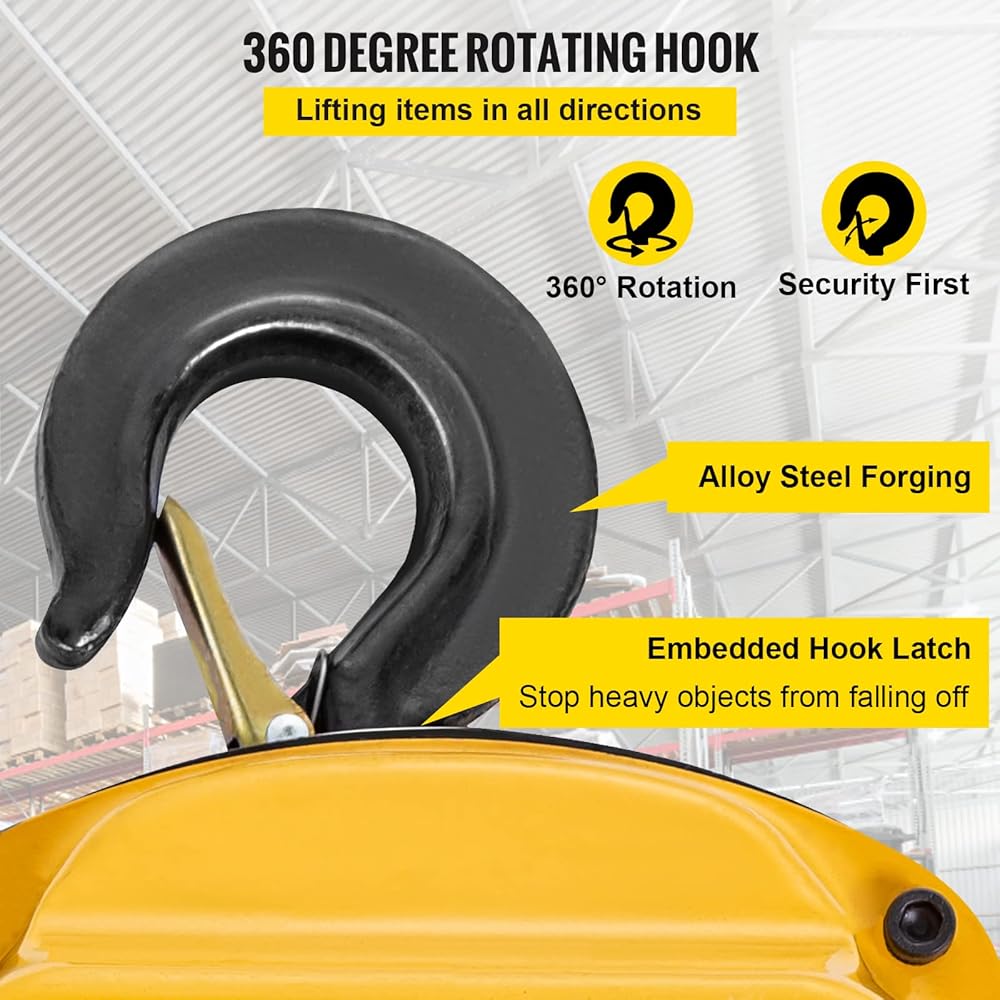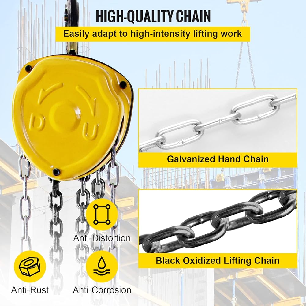 • تفاصيل مصممة جيدًا: رافعة الرفع الخاصة بنا مصنوعة من خطافين دوارين G80 يدوران 360 درجة، وسلسلة الرفع G80، وسلسلة اليد المجلفنة. يتم تثبيت جميع المكونات الدوارة على محامل كروية لتقليل الاحتكاك.