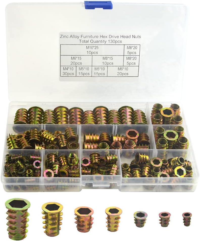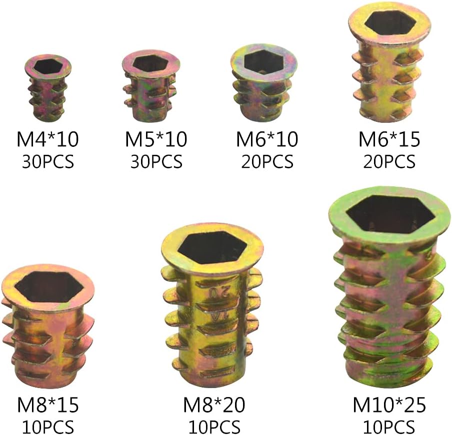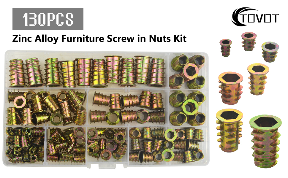 العبوة: تحتوي مجموعة صواميل الإدخال على 130 قطعة من المكسرات، M4(30 قطعة)، M5(30 قطعة)، M6(40 قطعة)، M8(20 قطعة)، M10(10 قطعة).