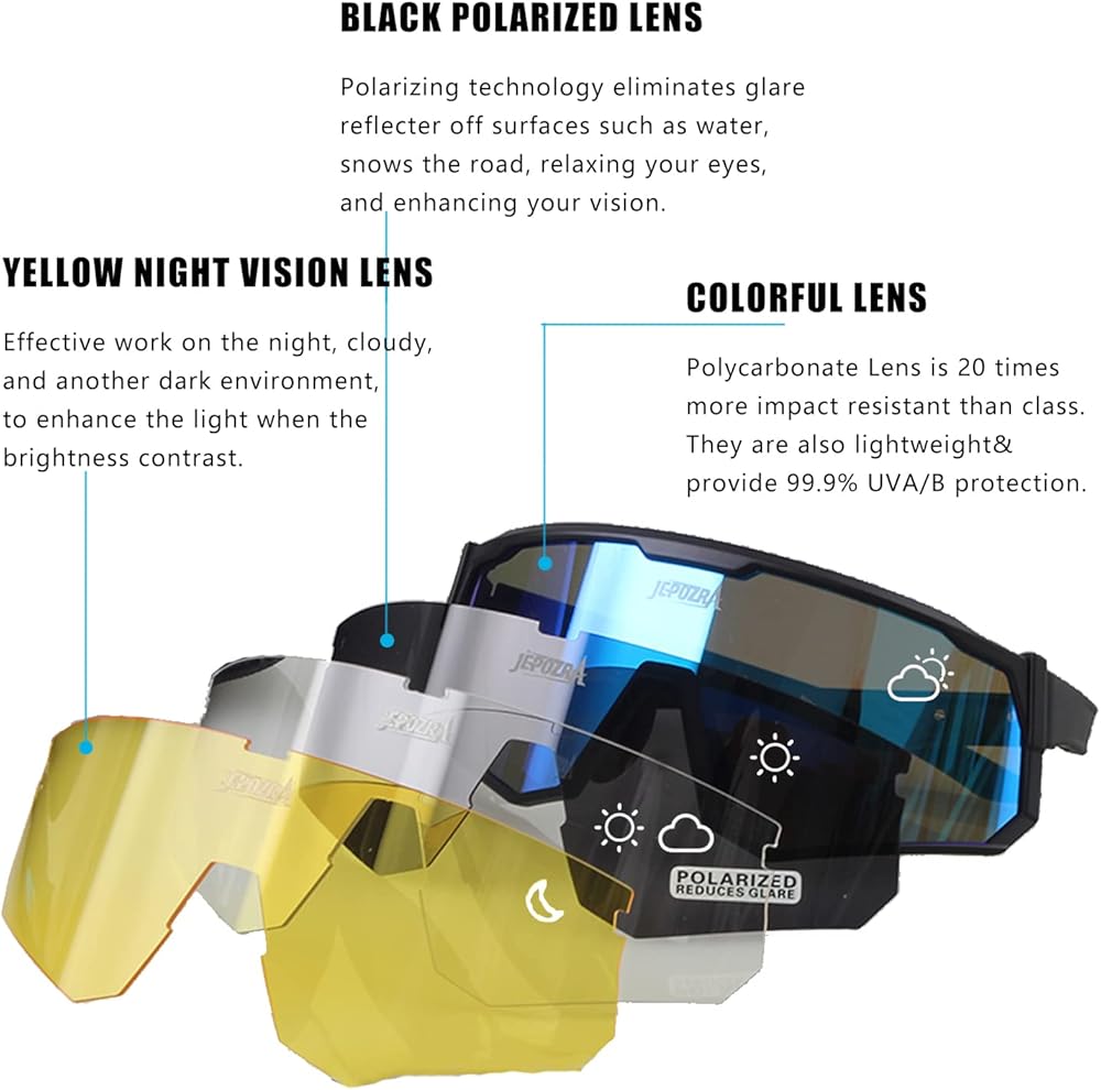 【عدسات قابلة للتبديل】نظارات ركوب الدراجات الخارجية مجهزة بـ 3 عدسات كبيرة، والتي يمكن أن توفر لك مجال رؤية أوسع، ومناسبة لجميع أنواع الطقس والمشاهد البديلة، العدسات الرئيسية هي عدسات ملونة؛ اللون الرمادي مستقطب لأنشطة القيادة؛ الأصفر مخصص للأنشطة الليلية. (يتم استقطاب لون رمادي واحد فقط)
