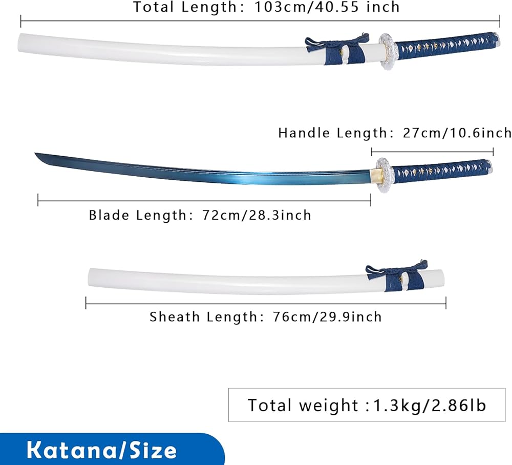 • الطول الإجمالي للكاتانا: 40.55 بوصة/103 سم، طول الشفرة: 28.3 بوصة/72 سم، طول المقبض: 10.6 بوصة/27 سم، الوزن: 2.86 رطل.