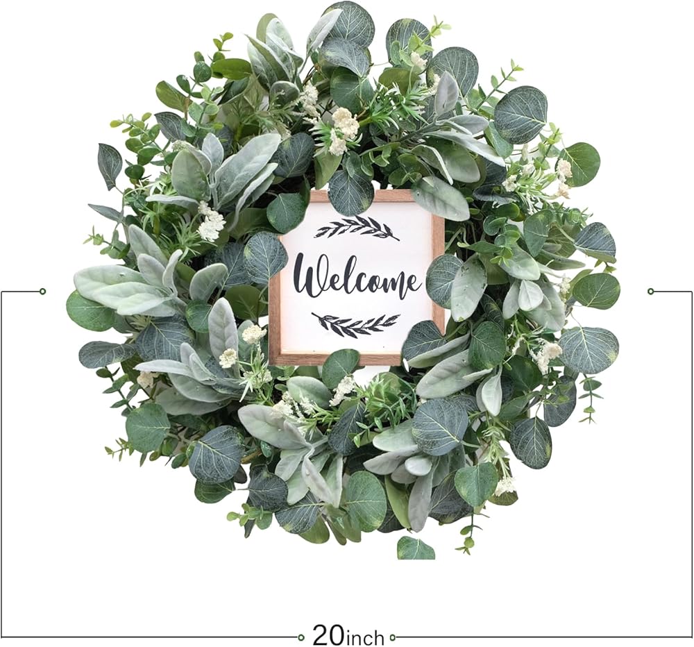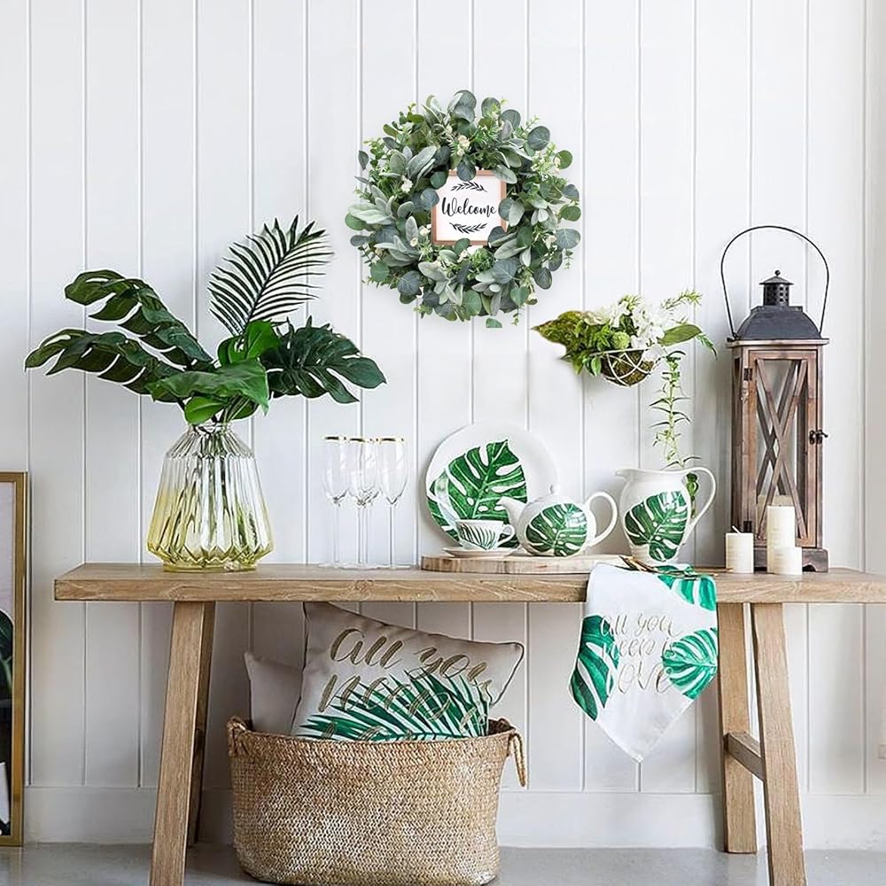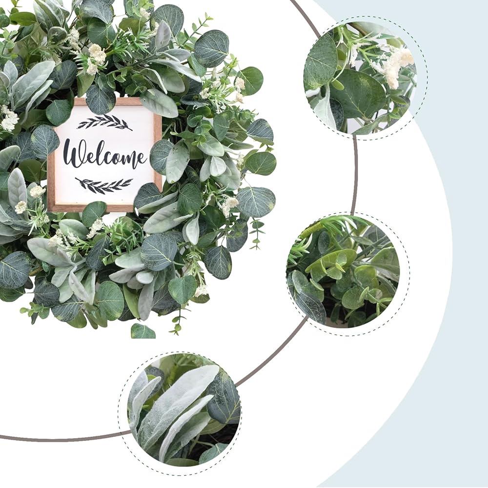 Eucalyptus Wreath】The green eucalyptus wreath is made of high-quality material, full of faux silk eucalyptus leaves. The base is durable vine. The entirely realistic wreath has bright color and vibrant looking, the wood sign makes this wreath more texture and romantic.