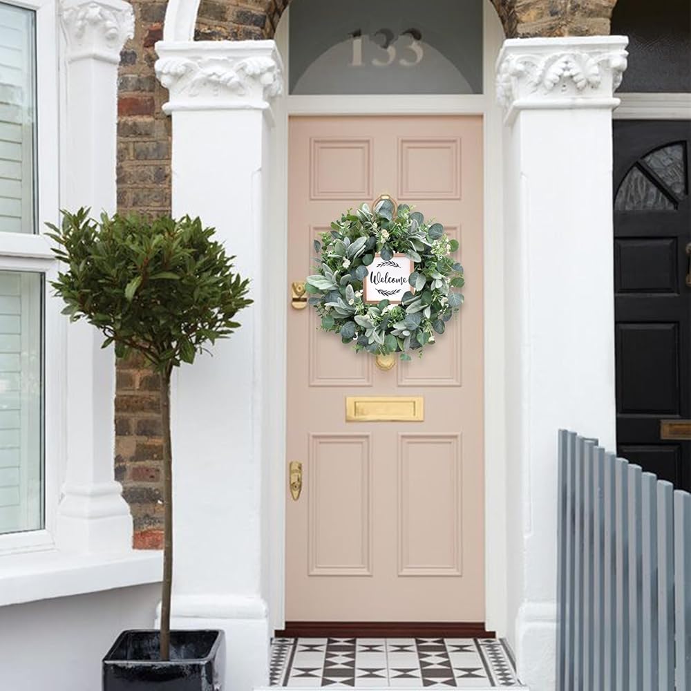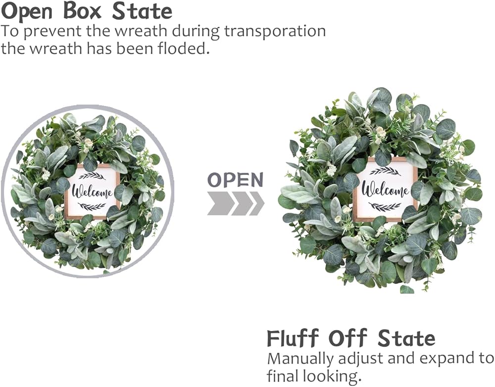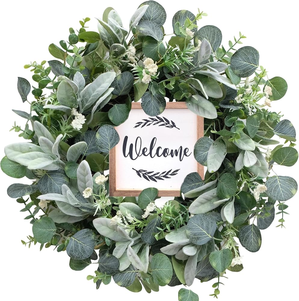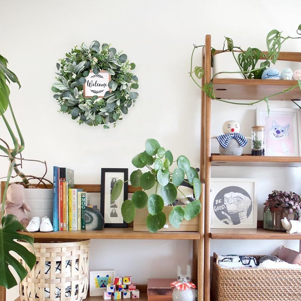 Eucalyptus Wreath】The green eucalyptus wreath is made of high-quality material, full of faux silk eucalyptus leaves. The base is durable vine. The entirely realistic wreath has bright color and vibrant looking, the wood sign makes this wreath more texture and romantic.