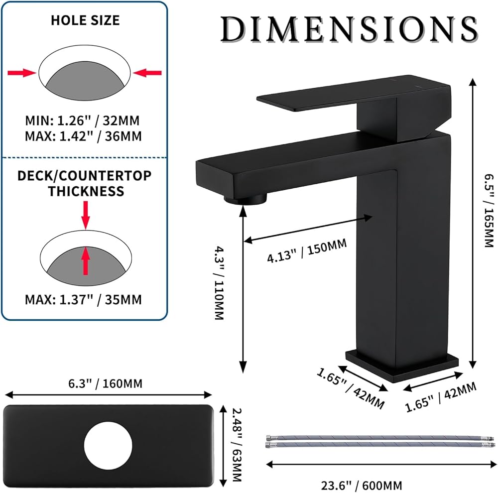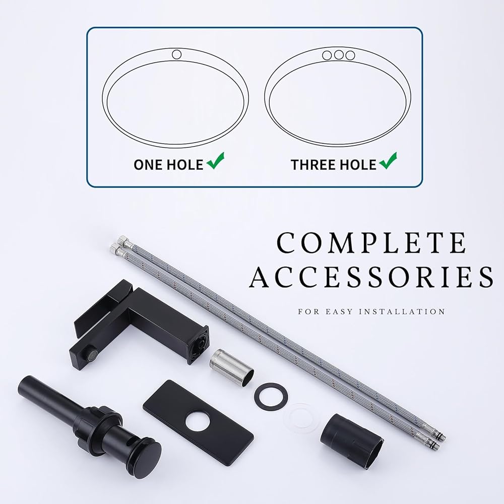 • ◀ 【ملحقات كاملة】صنبور حوض الحمام الأسود سهل التركيب. يتم تضمين جميع أجزاء التثبيت وتعليمات التثبيت وأنابيب مدخل المياه الساخنة والباردة في العبوة.