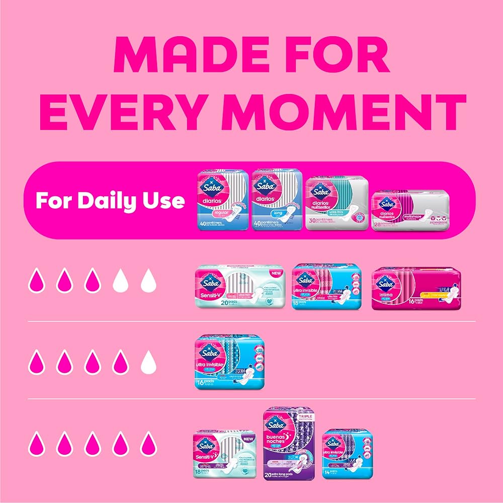 بطانات سابا دياريوس الطويلة، للاستخدام اليومي، تمتص في ثوانٍ، مسامية، تشعر بالانتعاش والراحة طوال اليوم مع طبقة علوية ناعمة، 160 قيراط