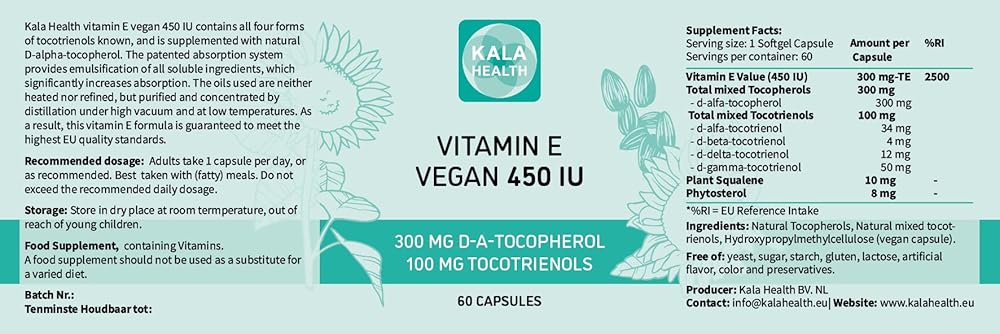 يحتوي على جميع التوكوترينول الأربعة + ألفا توكوفيرول - ألفا توكوفيرول، ألفا توكوترينول، دلتا توكوترينول وغاما توكوترينول. لإكمال حاجتك من فيتامين E.