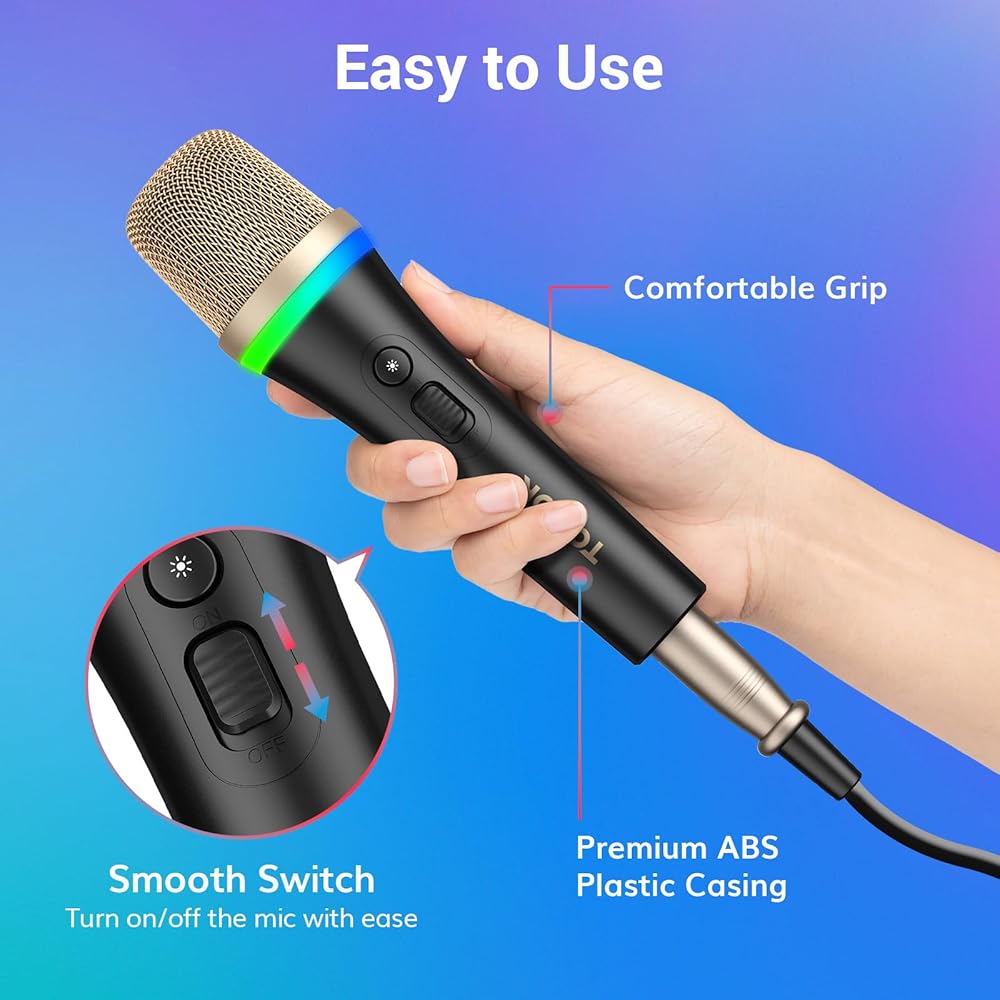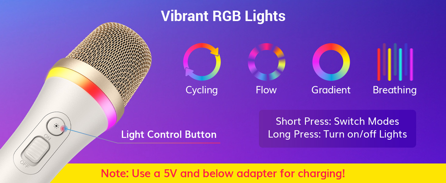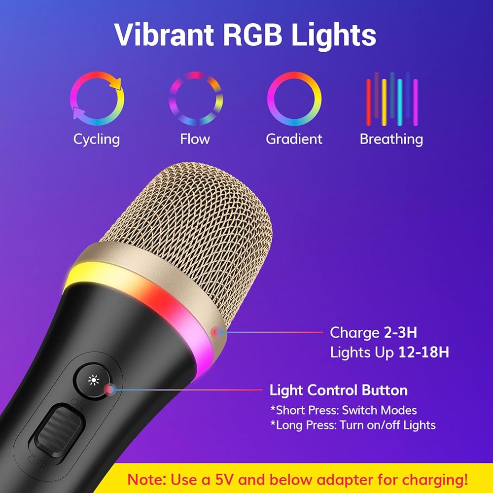 أضواء RGB النابضة بالحياة: يتميز ميكروفون الغناء الديناميكي هذا بمصابيح RGB نابضة بالحياة مع أربعة أوضاع (التنفس، وركوب الدراجات، والتدرج، والتدفق الطيفي) لخلق جو مثالي للكاريوكي والحفلات. اضغط لفترة قصيرة لتبديل أوضاع الإضاءة، واضغط لفترة طويلة لمدة ثانيتين لتشغيل/إيقاف تأثيرات الإضاءة. تضيف وظيفة الذاكرة راحة إضافية لك.