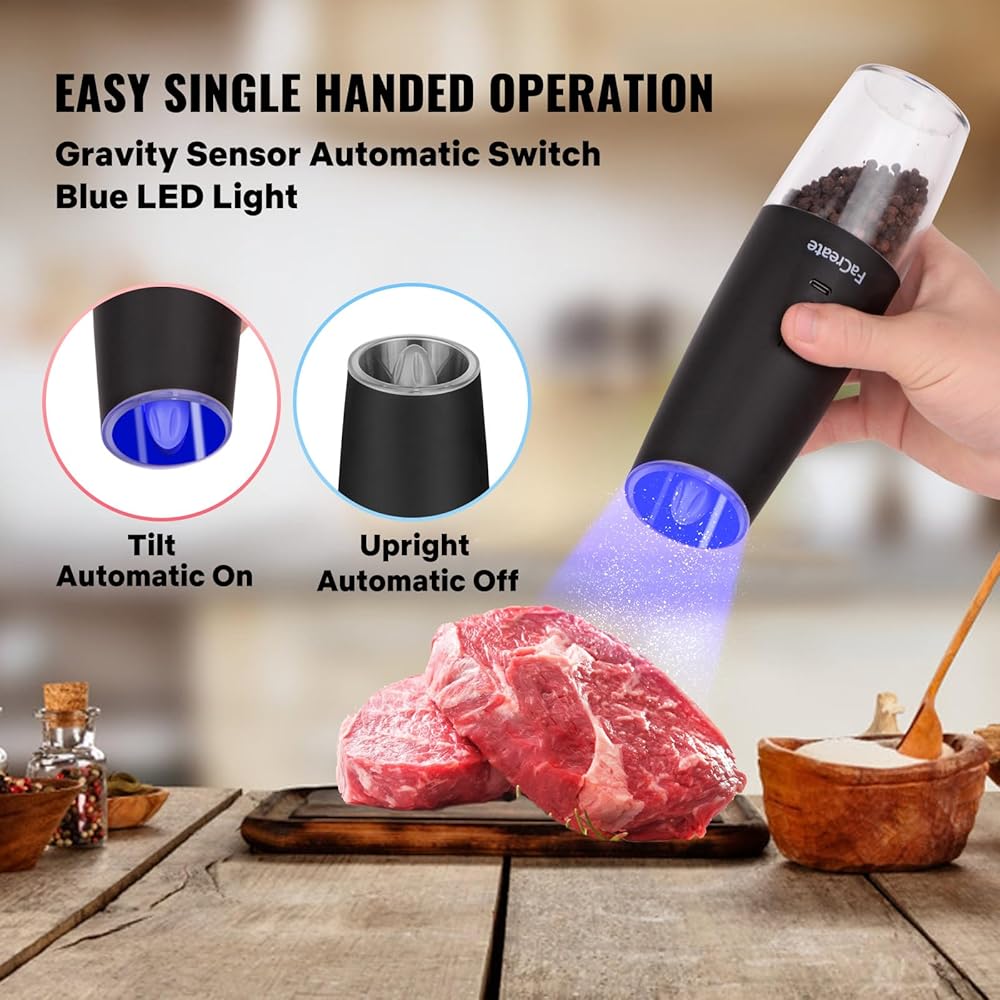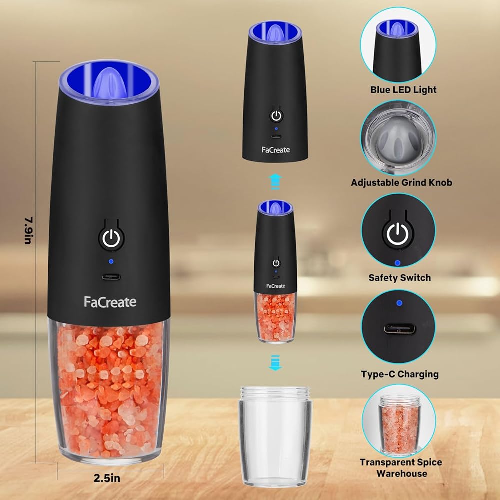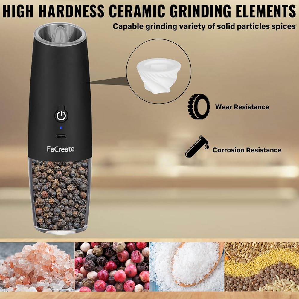 【مطحنة جاذبية مطورة وقابلة لإعادة الشحن】تم ترقية مجموعة مطحنة الجاذبية الكهربائية القابلة لإعادة الشحن من FaCreate من نموذج مجموعة مطحنة الجاذبية لبطارية AAA إلى نموذج بطارية ليثيوم قابلة لإعادة الشحن بسرعة USB-C بقدرة 500 مللي أمبير في الساعة (كل مطحنة). وهذا لا حاجة لشراء بطاريات إضافية و مما يوفر لك الكثير من تكاليف البطارية. وفي الوقت نفسه، تم أيضًا ترقية مطحنة الملح والفلفل الكهربائية القابلة لإعادة الشحن بمحرك عالي السرعة، والذي يطحن بشكل أكثر كفاءة وأكثر تجانسًا وحساسة. هذه هدية رائعة لأدوات المطبخ للترحيب بالمنزل الجديد.