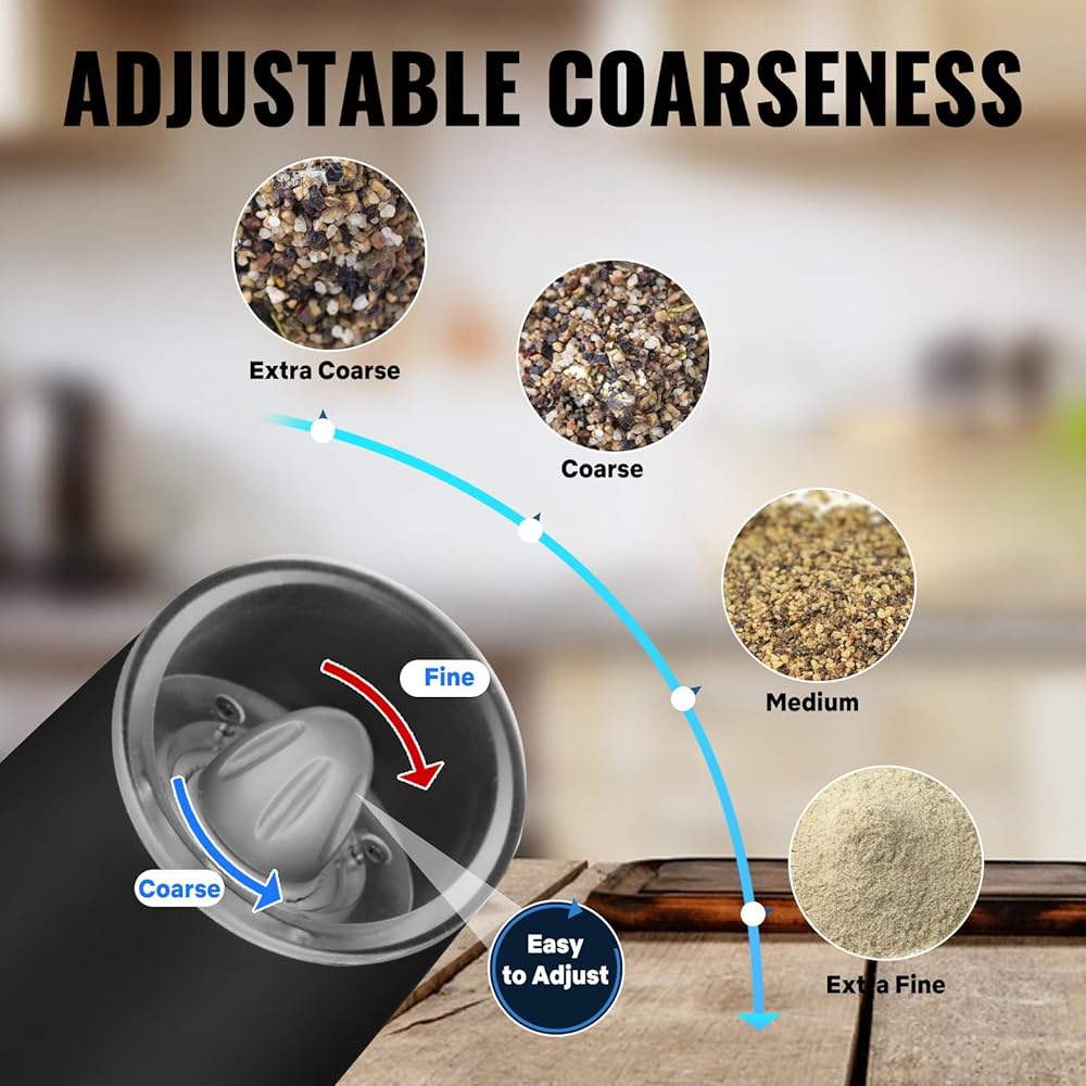 【خشونة قابلة للتعديل】تعتمد مطحنة الملح والفلفل الكهربائية القابلة لإعادة الشحن على قلب طحن سيراميك عالي الصلابة، والذي يطحن بالتساوي، ومقاوم للتآكل، ويحتفظ بنكهة التوابل الطازجة. الجزء العلوي من مطحنة الملح والفلفل القابلة لإعادة الشحن مجهز بمقبض قابل للتعديل بسمك، قم بتدويره في اتجاه عقارب الساعة إلى جزيئات دقيقة وقم بتدويره عكس اتجاه عقارب الساعة لطحنه إلى جزيئات خشنة. ما عليك سوى إدارة المقبض العلوي لضبط سمك الملح أو الفلفل الذي تحتاجه بسهولة .