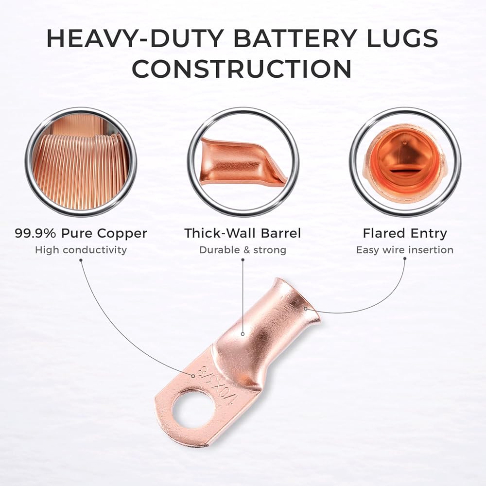 〖Reliable Lugs〗These battery cable lugs are designed with a heavy duty construction for high temperature durability and enhanced mechanical strength. And closed end design, keeping electrical components, batteries and cables safe and free from moisture, and also prevents solder from leaking during installation. The wire terminals features a flared opening to facilitate cable insertion.