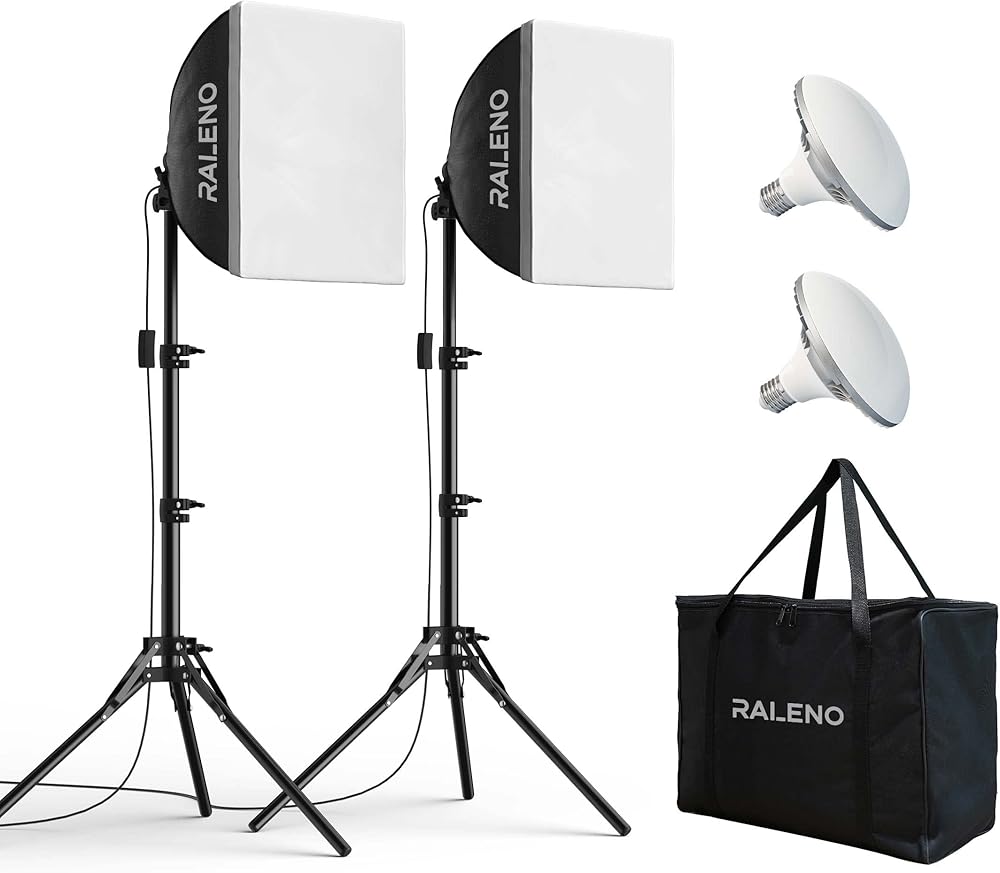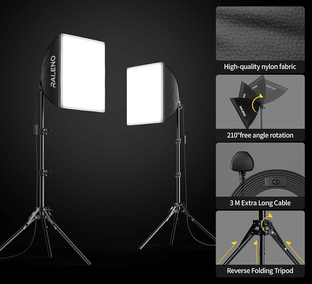 • SUPER BRIGHT MINI SOFTBOX : RALENO softbox lighting kit is a game changer! With a smaller size and the same brightness, this mini soft box is extremely convenient to use or store. Its lightweight design allows for hassle-free portability and can be easily used on the floor or on the table.
