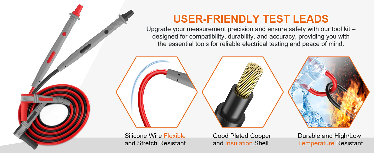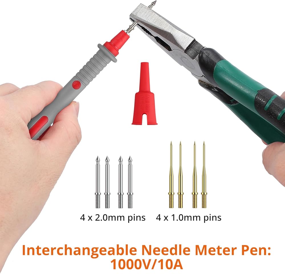 متعددة الاستخدامات: يمكن استخدام مجسات اختبار المقاييس المتعددة المطلية بالذهب القابلة للاستبدال، ومشابك التمساح، وخطاف الاختبار ودبابيس المسبار الخلفي في بيئات قياس مختلفة مثل الصناعة والإلكترونيات والمنزل والسيارات.
