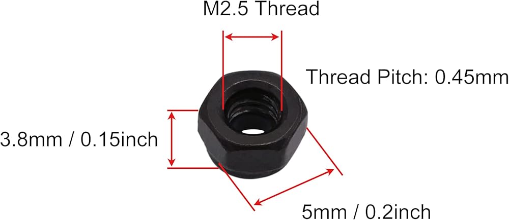 • SIZE - Nut Diameter: M2.5; Thread Pitch: 0.45mm; Coarse Threads; Width: 5mm; Height: 3.8mm; Standard: DIN985.