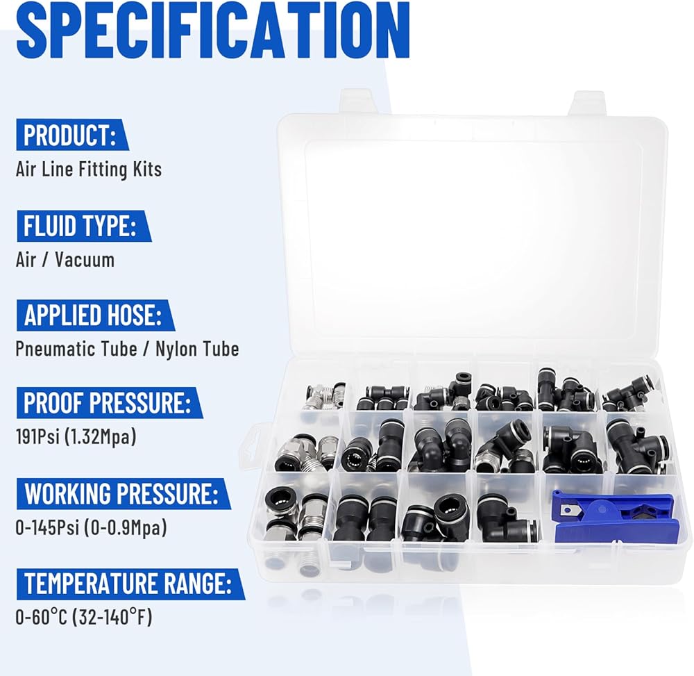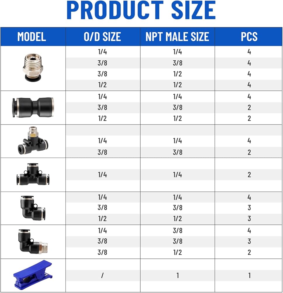 52 قطعة من مجموعات تركيب خط الهواء سريعة التوصيل، 1/4 بوصة، 3/8 بوصة و1/2 بوصة NPT دفع لربط التركيبات، تركيبات خرطوم الهواء موصل أنابيب النايلون، تتضمن قاطع الأنبوب