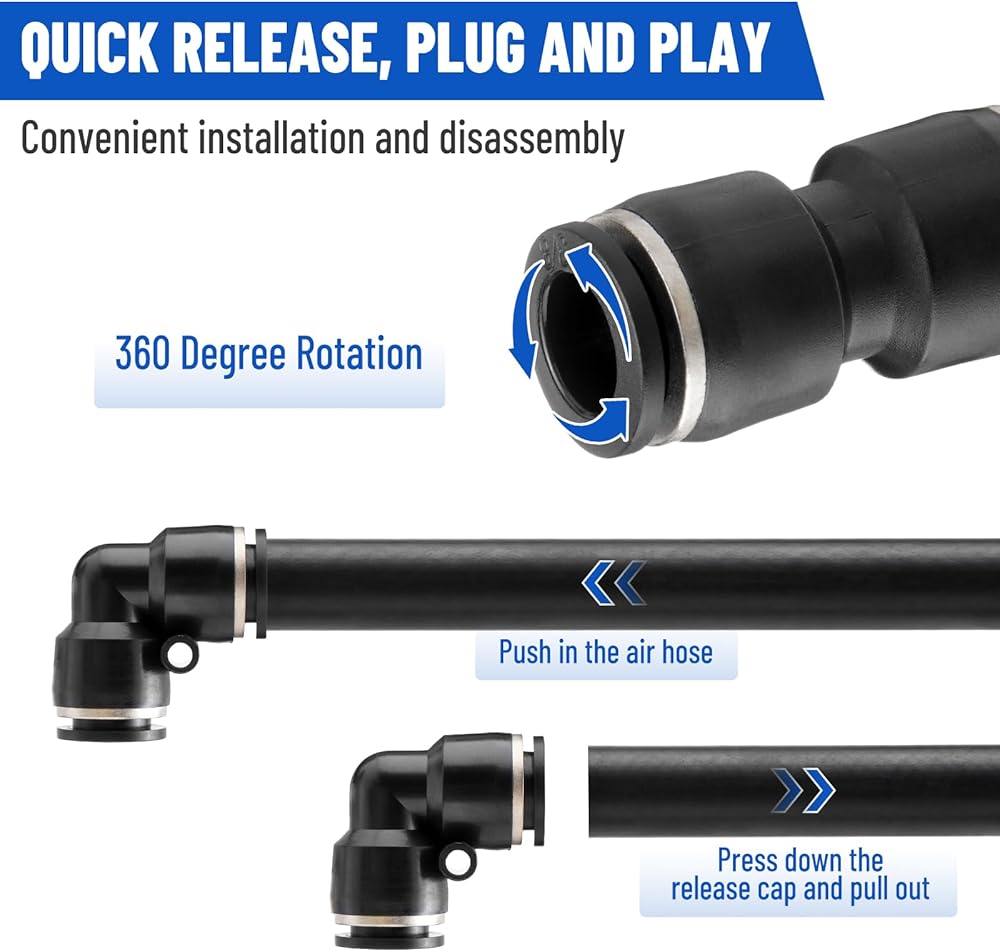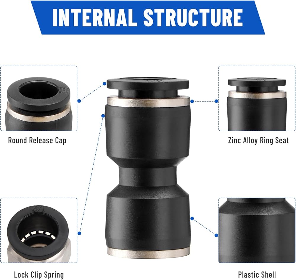 • مادة عالية الجودة: مجموعة تركيب الهواء بقفل الدفع مصنوعة من مادة PBT مع مخالب قفل من الفولاذ المقاوم للصدأ وغسالات فولاذية، يمكنها تحمل الضغط القوي دون التعثر.