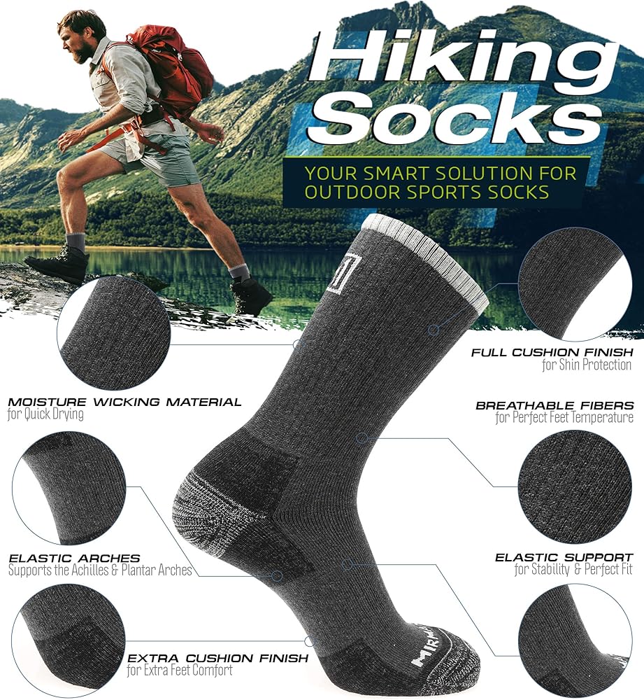 ✅ جوارب المشي لمسافات طويلة بأعلى جودة - جوارب المشي لمسافات طويلة هذه مصنوعة من مزيج مثالي من 85% قطن، 10% بوليستر، 5% ألياف البولي يوريثين لتعزيز النعومة والتمدد وتجربة ارتداء مريحة. يقلل من تعب القدمين ويسرع عملية الشفاء أثناء المشي لمسافات طويلة أو الأنشطة الخارجية الأخرى.