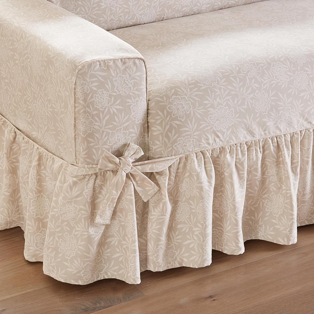 Premium Sofa Slipcovers: Elevate your space with the Essential Twill Ruffle Sofa Cover. The chic sofa slipcover features a special finish that resists water-based stains. One piece design with ruffled skirt shields sofas from daily wear and tear