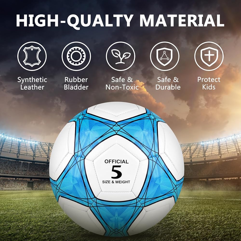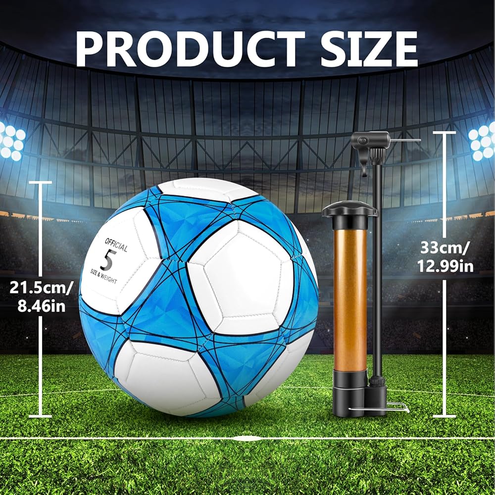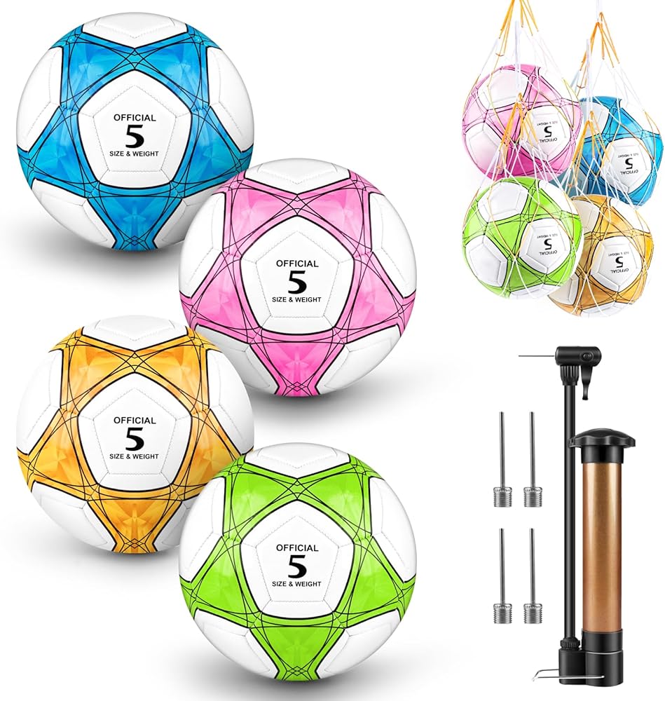 كرة قدم مقاس 5 مع مضخة هواء واحدة و4 إبرة مضخة و4 حقيبة شبكية - كرة قدم بالحجم والوزن الرسميين، نسيج محكم من البولي يوريثان سميك مناسب لممارسة التدريب على ألعاب دوري الشباب والكبار أو هدية (4 قطع)