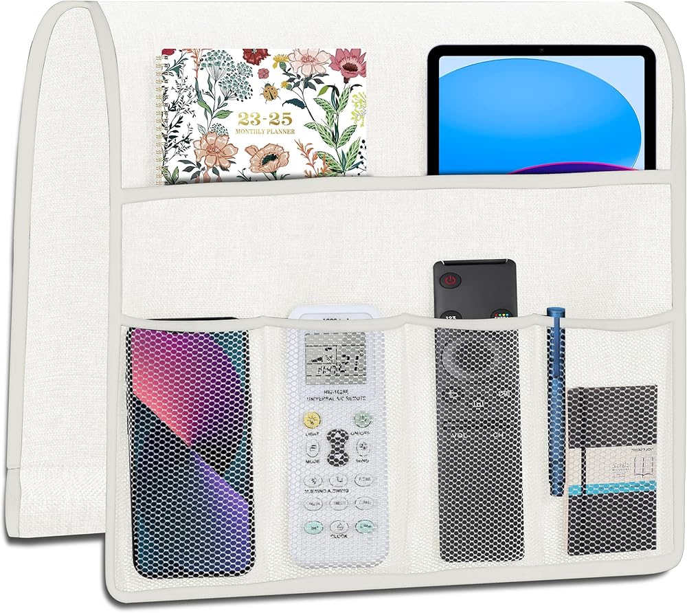 حامل جهاز التحكم عن بعد من Joywell لكرسي الكرسي بذراعين ومسند الذراع ومنظم للأريكة وكرسي بذراعين مع 6 جيوب لتخزين المجلات والكمبيوتر اللوحي والهاتف والآيباد وجيوب شبكية، أبيض