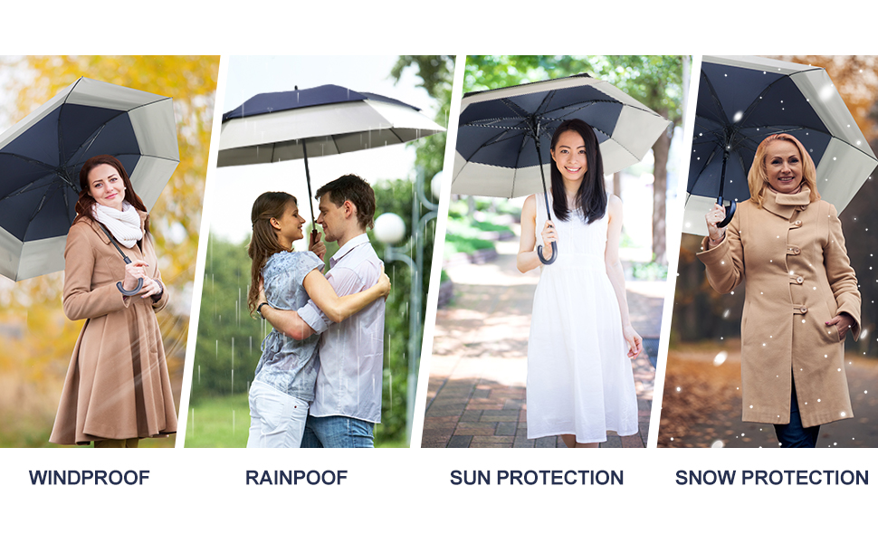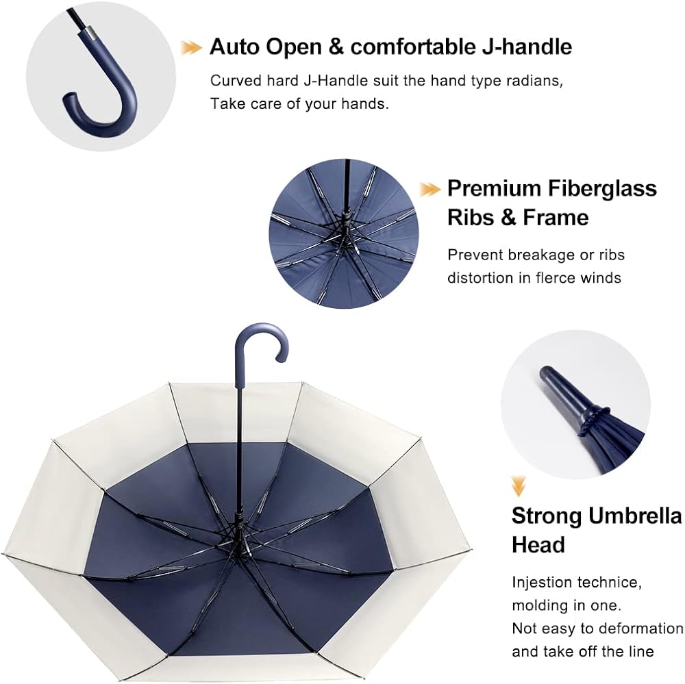 فتح تلقائي: مقبض EVA مريح، اضغط على الزر بيد واحدة، يمكنك فتحه بسهولة. تضمن وظيفة الفتح التلقائي عدم وجود أي تأخير لراحتك. على وجه الخصوص، المظلة مناسبة للعب الجولف. المقبض يناسب عربة الجولف بشكل جيد للغاية. يحفظك من الأشعة فوق البنفسجية والرياح القوية والمطر.