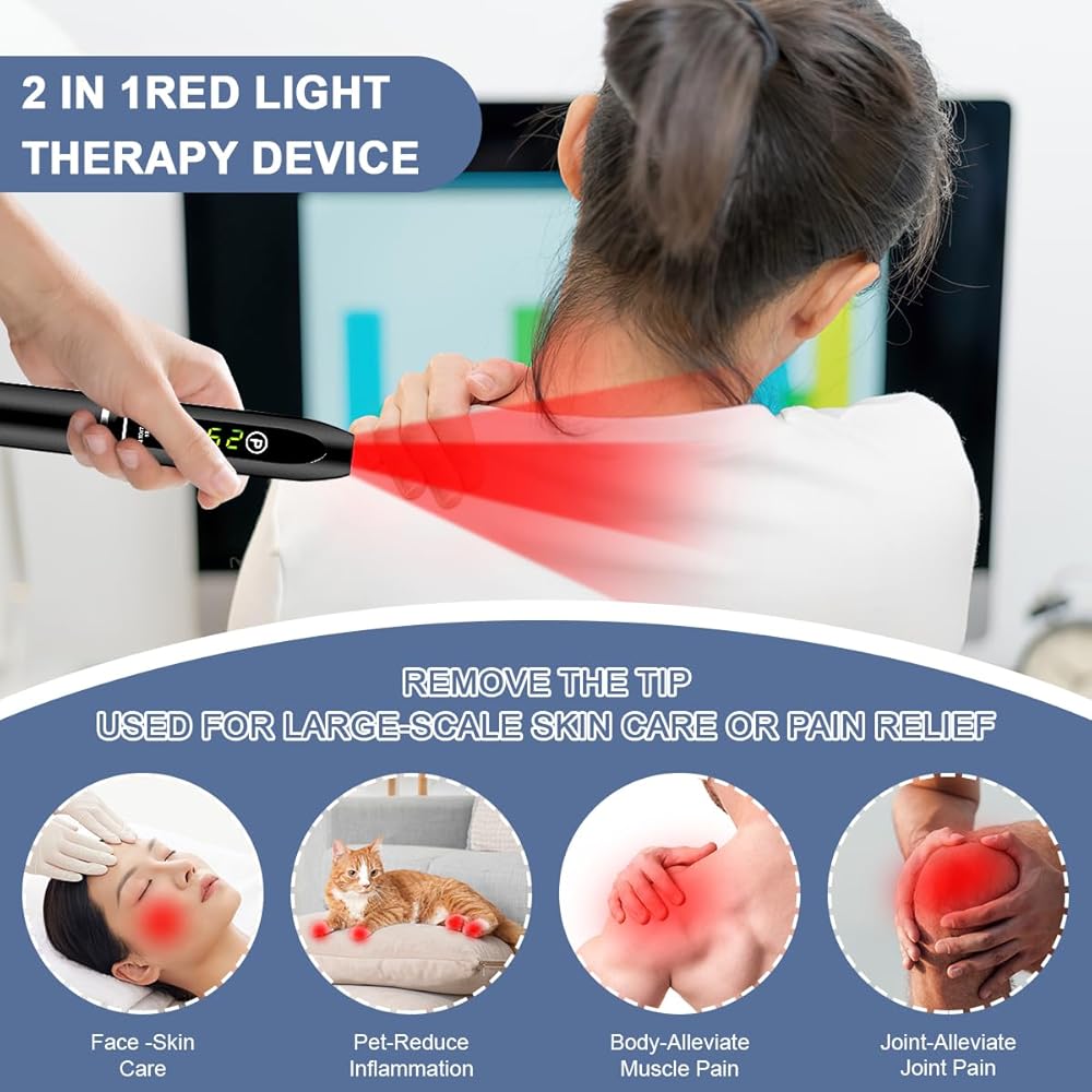 【جهاز الضوء الأحمر متعدد الوظائف 2 في 1】يتميز جهاز الضوء الأحمر الخاص بنا بطرف قابل للفصل، عند تركيبه، يوفر راحة مستهدفة للمناطق الصغيرة من عدم الراحة في الفم والشفتين والأذنين والأنف، ومعالجة مشكلات مثل البرد. القروح، آفة القروح، بثور الحمى، والشفة الهربس. تؤدي إزالة الطرف إلى تحويله إلى عصا ضوء حمراء محمولة مناسبة للعناية بالوجه أو تخفيف آلام المفاصل والعضلات.