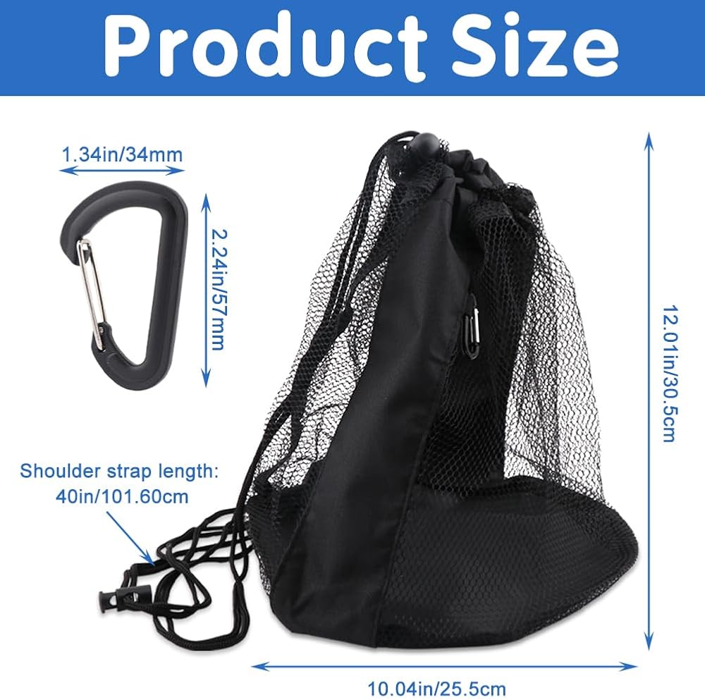 Feature: 【STURDY MATERIAL】Ball bag is made of lightweight mesh fabric, which is soft, tough, durable and not easy to break. It's washable, wear-resistant and colorfast, making it suitable for both kids and adults. 【BOTTOM MESH POUCH】The bottom of the ball bag is designed with a mesh pouch that can store towels and T-shirts. The mesh design is breathable and keeps items clean in separate mesh pockets. 【ADJUSTABLE STRAP】The drawstring bag shoulder strap is adjustable and can be carried on both shoulders or as one shoulder. The overall length of the strap is 40 inches, allowing most people to adjust the length based on their height and use. 【SIZE DETAILS】Round bottom, (L x W) 30.5 x 25.5cm/12.01 x 10.04inch, it is suitable for various sports balls, basketball, volleyball, rugby, football, easy to store and carry. It is also suitable as a beach bag and swimming bag. 【HANGING CARABINER】You will receive 1pc ball bag with 2pcs carabiner for easy hanging on a backpack or sports bag. Carabiners come into play when you don't want to carry the ball bag on your shoulders. Specifications: Color: black Material: mesh ball bag, POM plastic carabiner+metal carabiner Size: (about) Ball bag: (L x W) 30.5 x 25.5cm/12.01 x 10.04inch Shoulder strap length: 101.60cm/40inch Carabiner: (L x W) 57 x 34mm/2.24 x 1.34inch Package Includes: 2pcs x Carabiner 1pc x Ball bag Note: 1. Due to the light and screen difference, the item's color may be slightly different from the pictures. 2. Please allow 0.5-2 cm differences due to manual measurement.