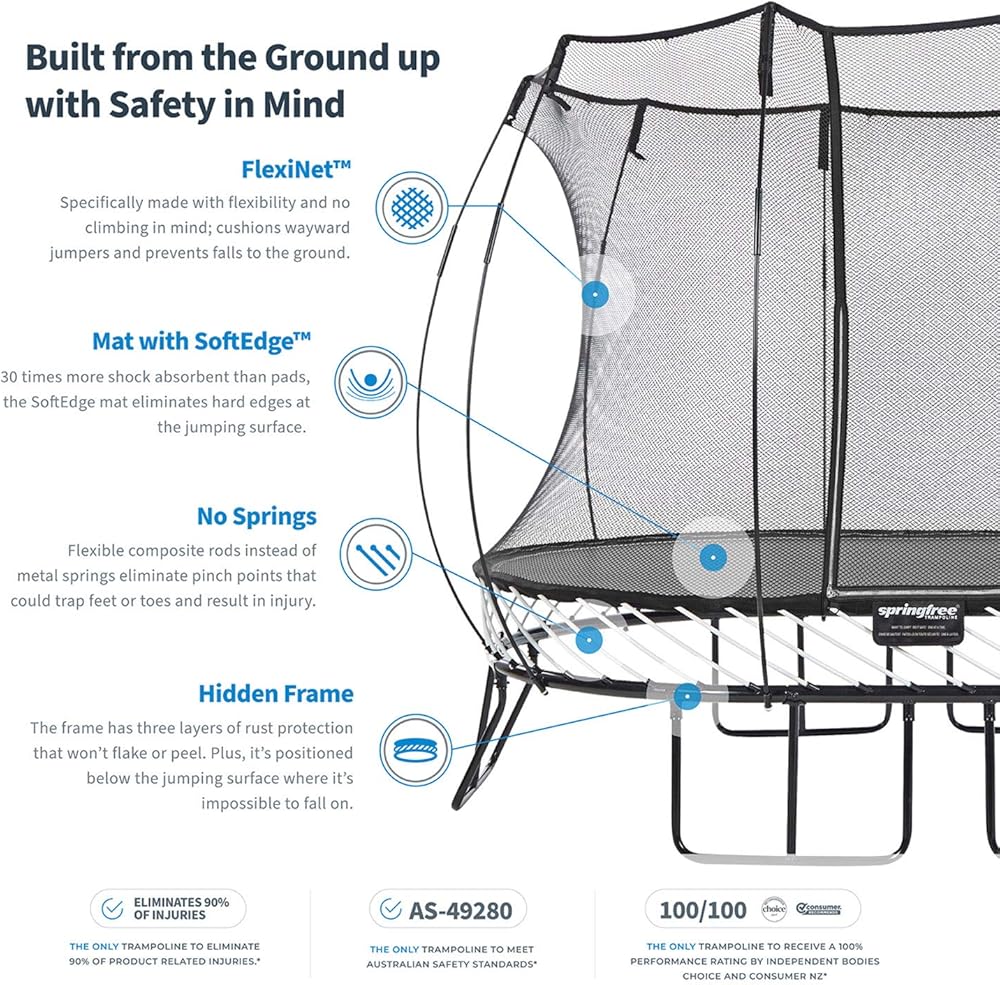 المتانة: تم اختبارها لتحمل ما يصل إلى 1500 رطل، مما يوفر دعمًا قويًا لجميع لاعبي القفز، مما يسمح للأفراد الذين يصل وزنهم إلى 220 رطلاً بالقفز إلى ما لا نهاية