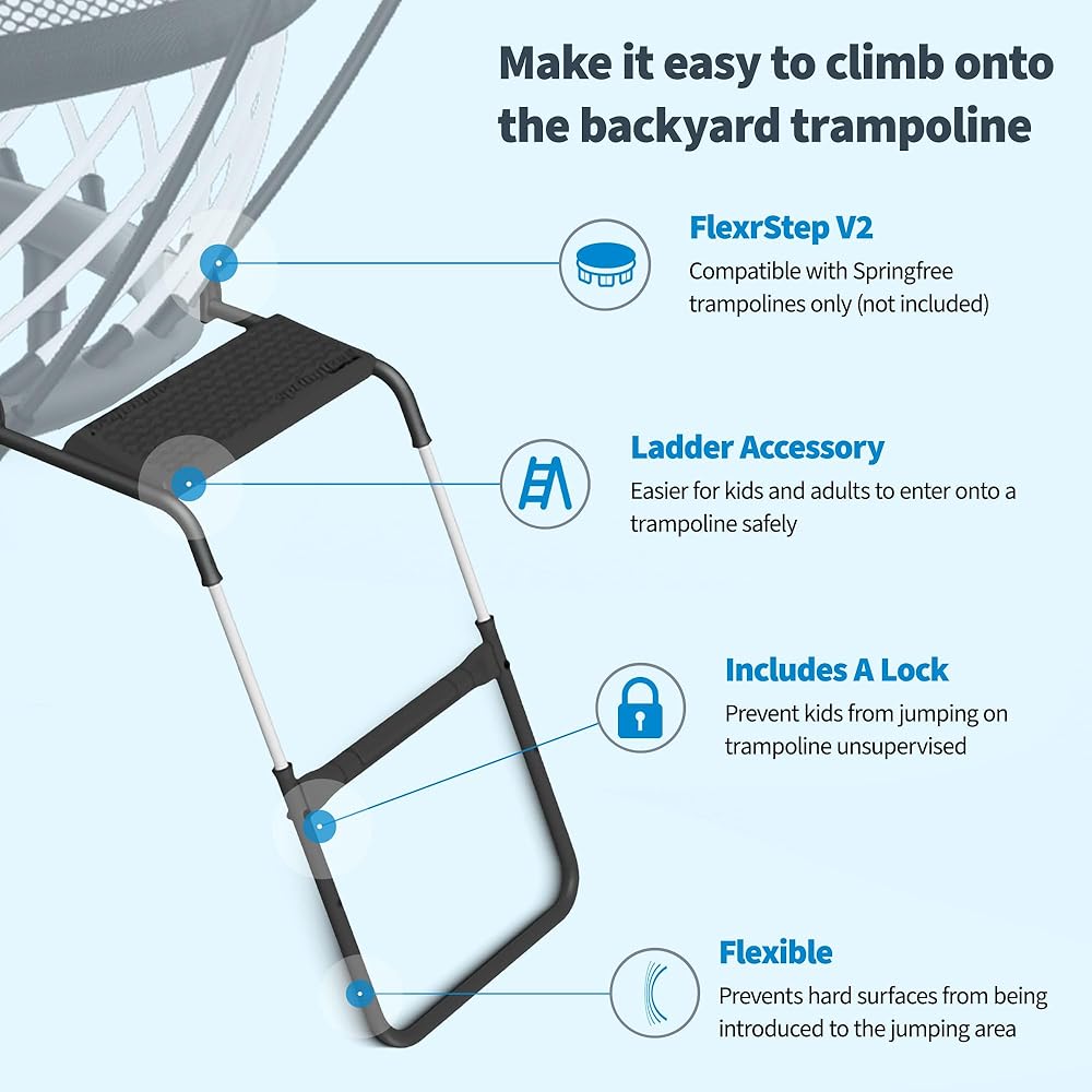 سلم FlexrStep: حصريًا لترامبولين Springfree، يدعم هذا السلم ما يصل إلى 154 رطلاً ويتضمن قفلًا لردع الاستخدام غير الخاضع للرقابة