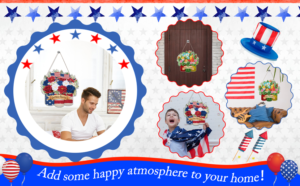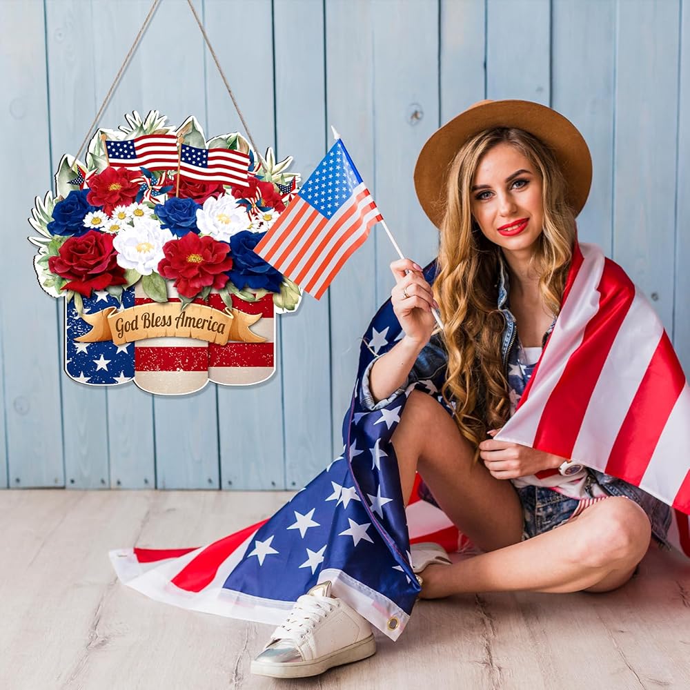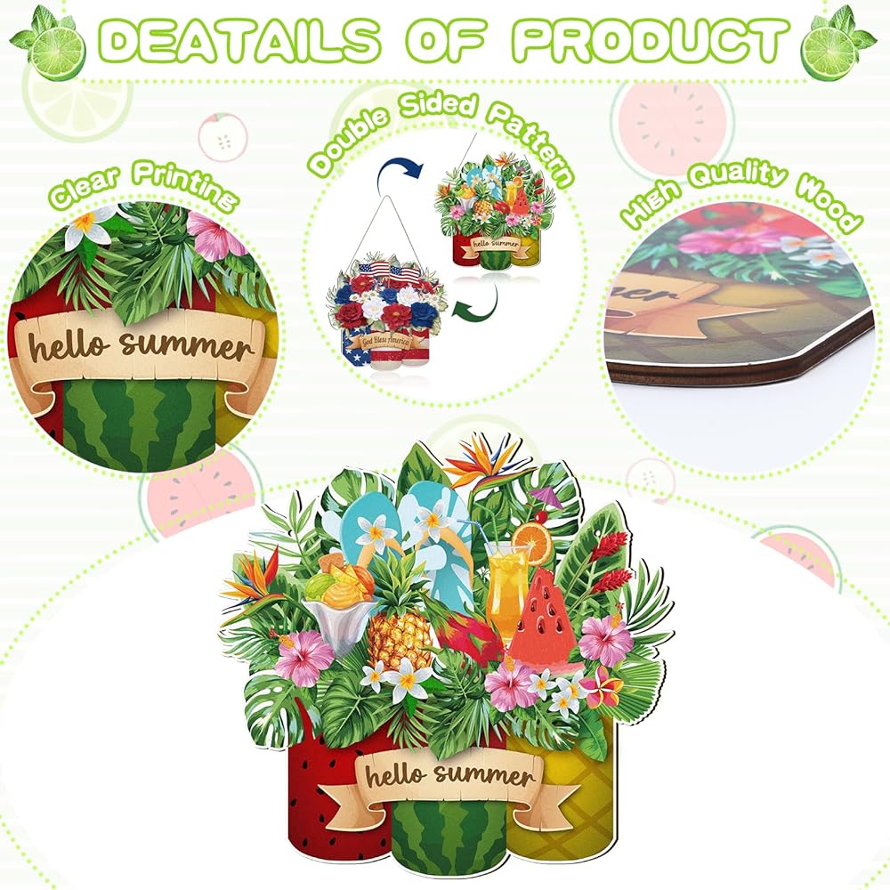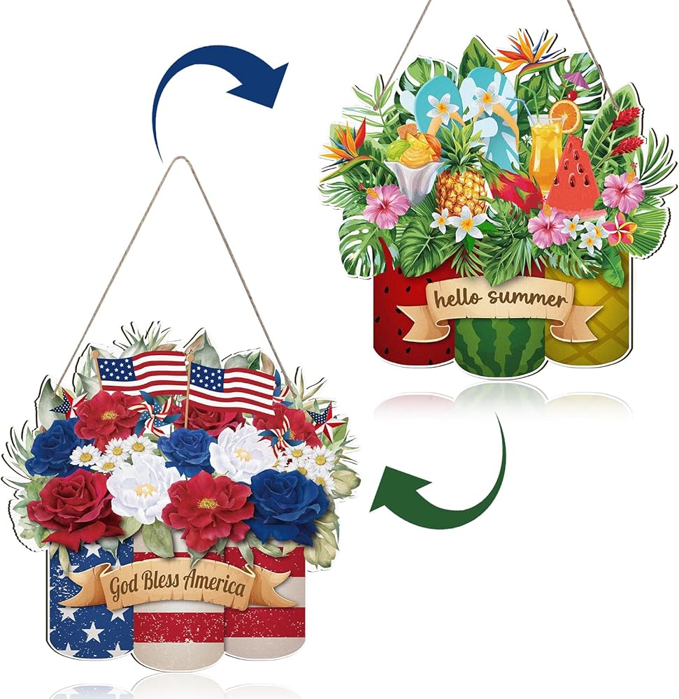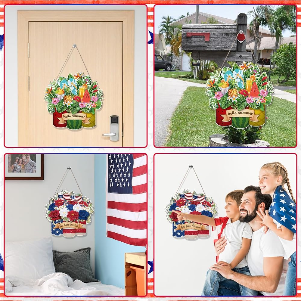 【تصميم فريد لسلة الزهور】تم تصميم ديكور المنزل الترحيبي لدينا على شكل سلة زهور على كلا الجانبين، وهو رقيق وجميل للغاية. يستخدم أحد الجانبين عناصر صيفية مثل الأناناس والبطيخ والزهور والنعال المطبوعة عليها عبارة "Hello Summer". يستخدم الجانب الآخر عناصر العطلات مثل العلم الأمريكي والزهور وعبارة "Glod Bless America". سواء كنت ترغب في الاحتفال بالصيف أو الترحيب بالعام السابع، فهو اختيار جيد لعيد الاستقلال في الرابع من يوليو.