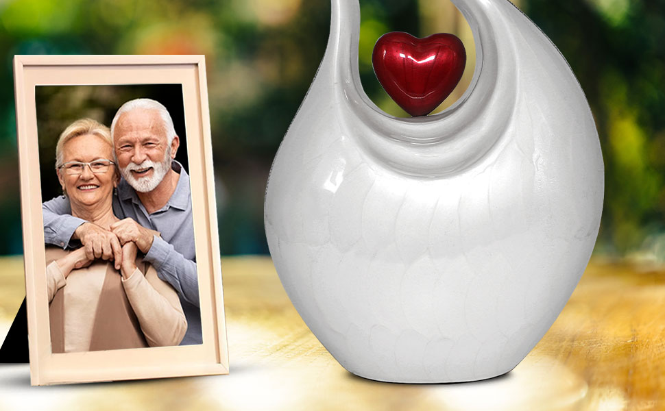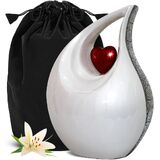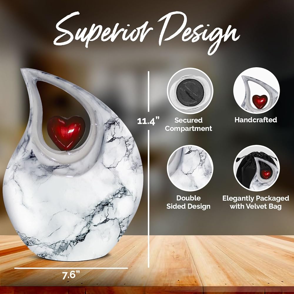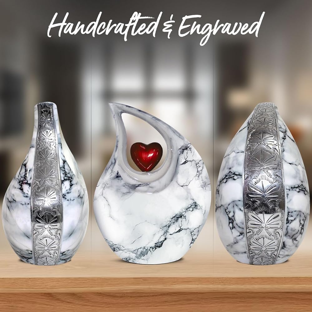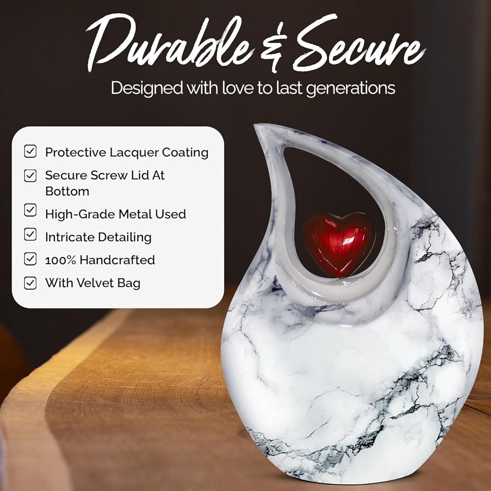 جرة دمعة عالية الجودة ومتينة لرماد حرق الجثث: هذه الجرة الكبيرة الجميلة للرماد البشري صلبة ومصنوعة من معدن عالي الجودة مع لمسة نهائية لامعة. تم تصميم الجرة المعقدة للبالغين يدويًا على يد حرفيين ذوي مهارات عالية باستخدام التقنيات التقليدية العريقة. كن مطمئنًا، هذه الدمعة الرائعة لحرق الجثث البيضاء ستكون بمثابة رمز مؤثر لذكرى أحبائك.