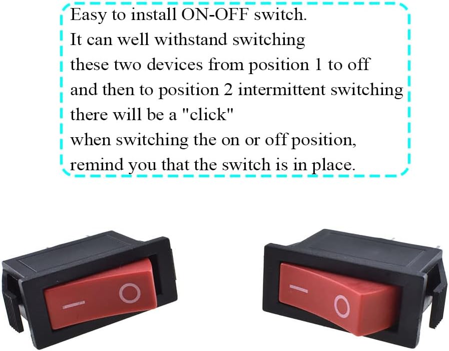 Clicks well into position.Easy to install ON-OFF switch.It can well withstand switching these two devices from position 1 to off and then to position 2 intermittent switching,and the internal connection is stable.Both switches work,there will be a "click" when switching the on or off position,remind you that the switch is in place.Simply press it to get to the desired position.