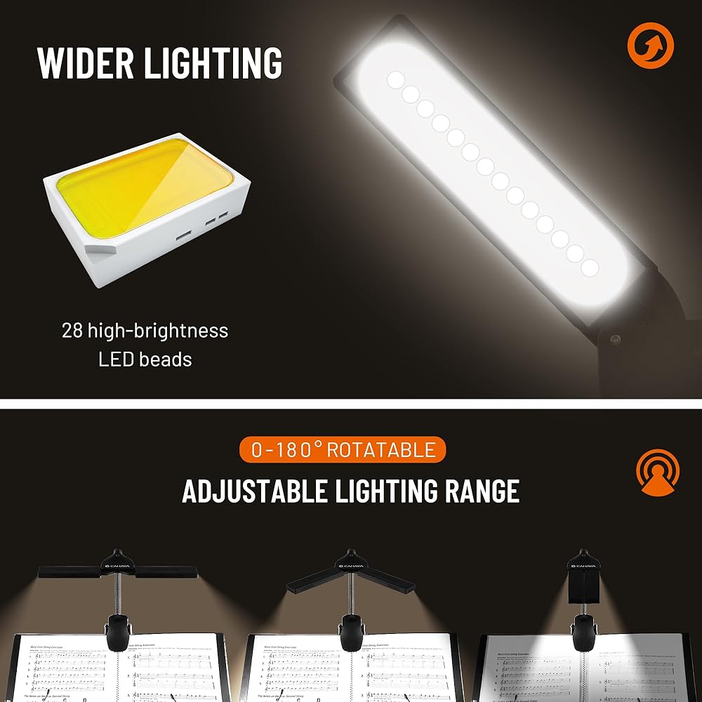 نظام الإضاءة المتقدم: استمتع بإضاءة دقيقة مع 28 مصباح LED عالي السطوع موزعة على لوحتين قابلتين للطي، مما يوفر تغطية واسعة بزاوية 180 درجة لحامل الموسيقى أو البيانو الخاص بك. اختر من بين ثلاثة أوضاع سطوع لتناسب أي حالة إضاءة.