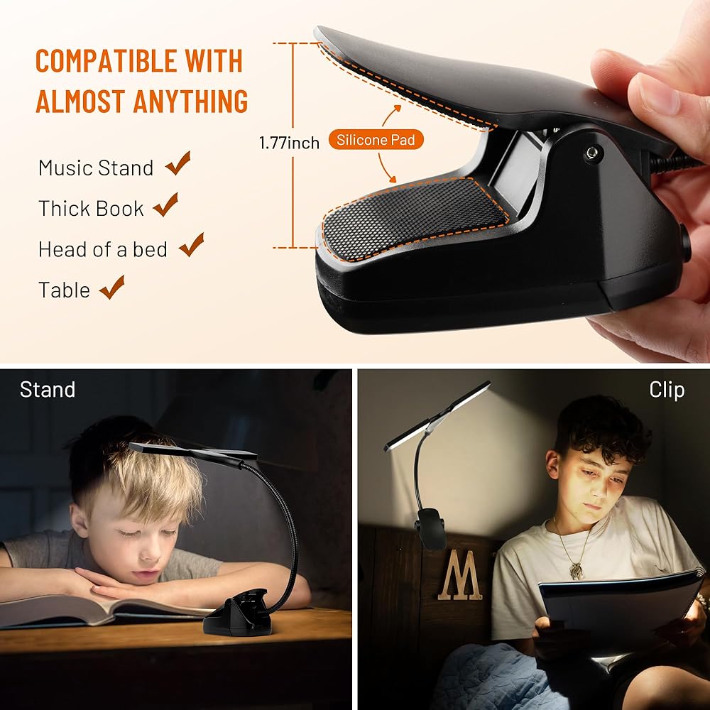قبضة آمنة: مجهزة بمشبك فم مقاس 1.77 بوصة ووسادات مطاطية غير قابلة للانزلاق، يتم تثبيت الضوء بشكل آمن على أي سطح، مما يوفر الثبات لحوامل الموسيقى أو البيانو أو المكاتب. إنه الرفيق المثالي للعروض أو جلسات القراءة أو التدريب في وقت متأخر من الليل.