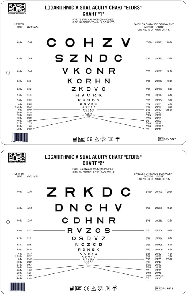 Standardized adult Sloan Letter near vision card with proportionally spaced (logMAR) lines in ETDRS format; line sizes range from 20/400 to 20/10 (6/120 to 6/3) equivalent. Attached 16-inch (40 cm) measuring cord ensures proper screening distance. Printed on two sides. 7" x 9" (17.8 cm x 22.9 cm).