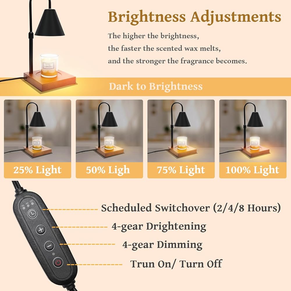 • 💡[وظائف التعتيم والمؤقت] مصباح تسخين الشموع مع مؤقت ووظائف التعتيم، يمكنك تخصيص الإعدادات للتحكم في سطوع الضوء وإطلاق الحرارة، كلما تم ضبطه أكثر سطوعًا، كلما ذوبان أسرع. استخدمي المؤقت (2H/4H/8H) لإيقاف ضوء مصباح ذوبان الشمع تلقائيًا بعد المدة المطلوبة، مما يضمن السلامة وتوفير الطاقة حتى تتمكن من النوم بسلام.