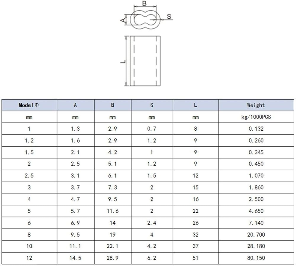 Sleeves, when properly applied, are capable of holding the rated breaking strength of the cable to which they are applied. However, to determine the exact holding strength, we recommend pull testing prior to use. This step ensures the proper selection of materials, the correct pressing procedure and an adequate margin of safety for the intended use.Package Content: 100(+/-2%) x Wire Rope Aluminum SleeveOverall Size: 9 x 6 x 3mm/0.35" x 0.24" x 0.12"(L*W*T)Fit for Steel Wire Rope Diameter: 1.5mm/1/16"