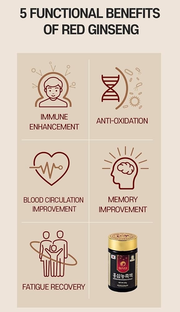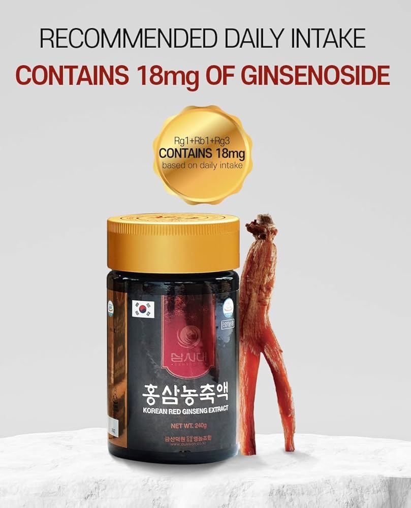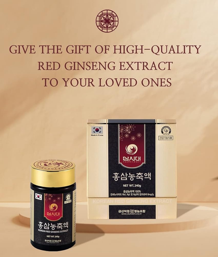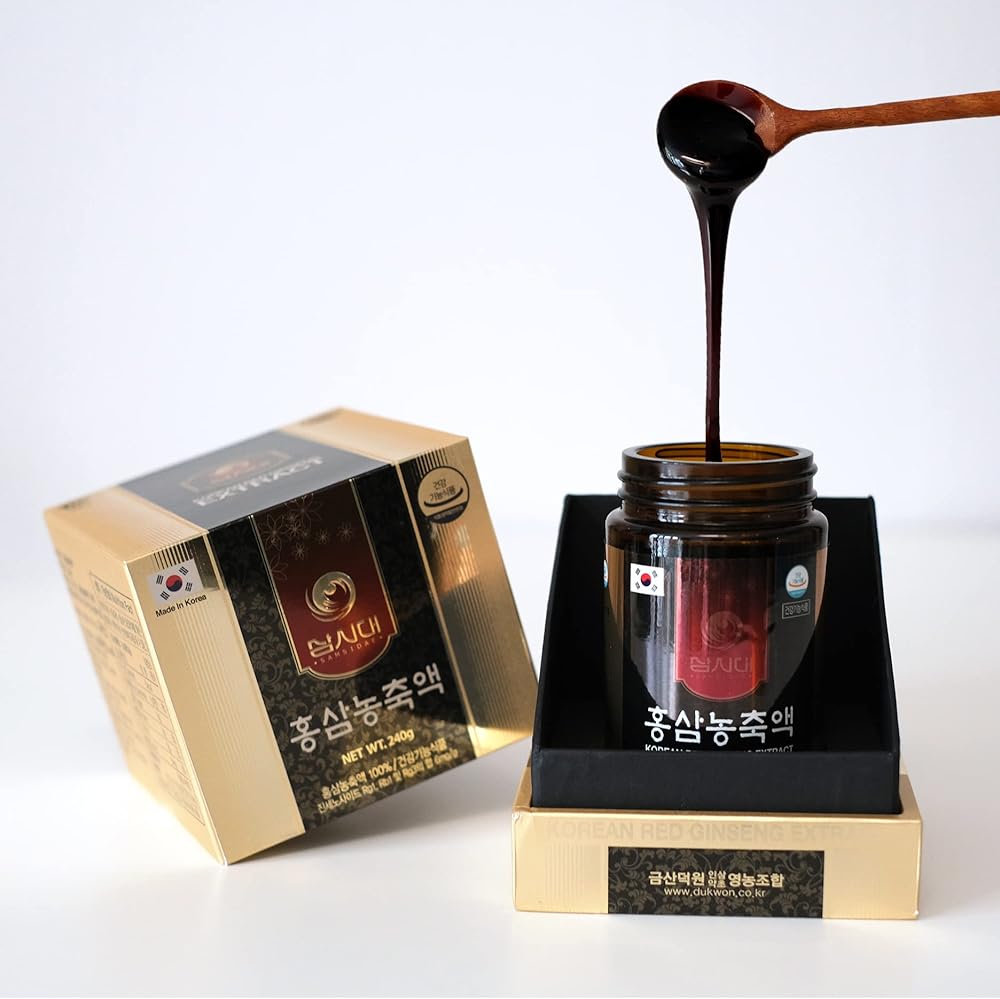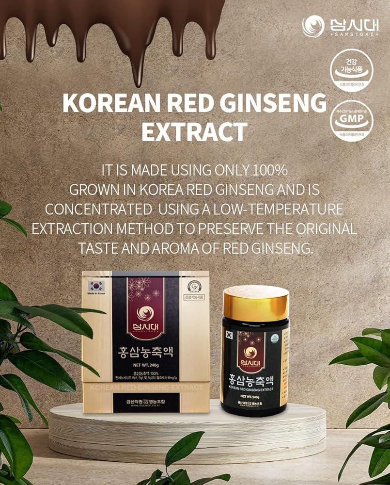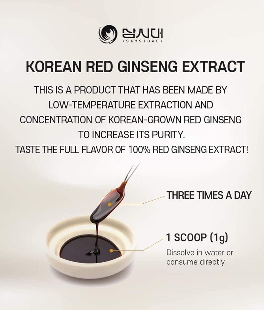 IT IS MADE USING ONLY 100% GROWN IN KOREA RED GINSENG AND IS CONCENTRATED USING A LOW-TEMPERATURE EXTRACTION METHOD TO PRESERVE THE ORIGINAL TASTE AND AROMA OF RED GINSENG. WHY CHOOSE SAMSIDADE KOREAN RED GINSENG EXTRACT?: 100% Korean-Grown Ginseng, 100% Red Ginseng Extract, Ginsenoside Content 6mg/g. CAREFULLY CAPTURED THE NUTRITIONAL BENEFITS OF SELECTED KOREAN RED GINSENG WITHOUT ADDING ANY OTHER INGREDIENTS. Vegan & Non-Gmo: 100% Korean Red Ginseng Extract, VEGAN and NON-GMO. It is PURE with No ADDITIVES OR PRESERVATIVES