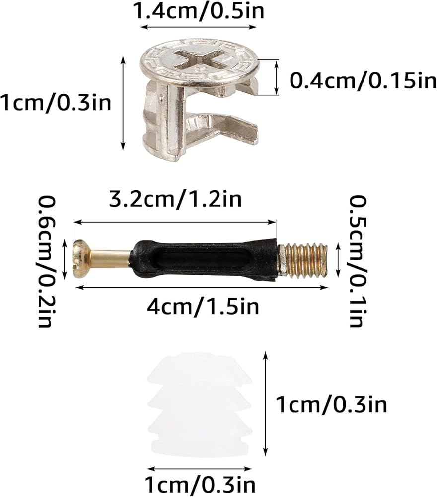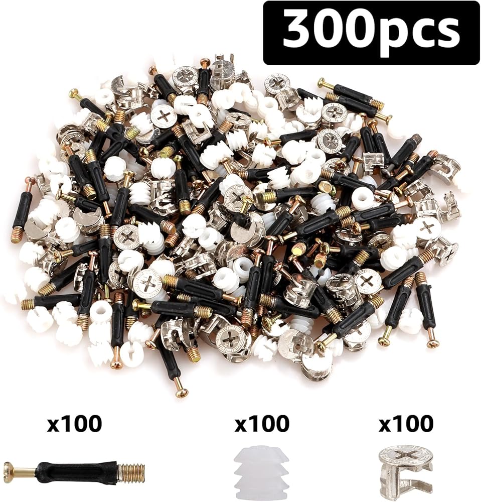 • [Quantity]: 300 sets 3 in 1 furniture connecting fittings, (100pcs 0.6″/14.5mm cam fittings +100pcs 1.57″/40mm dowels + 100pcs pre-inserted nuts).