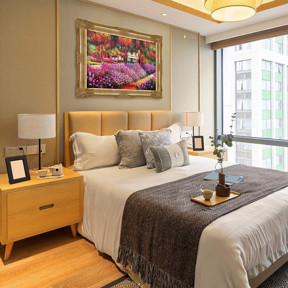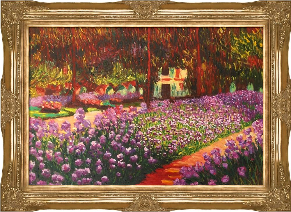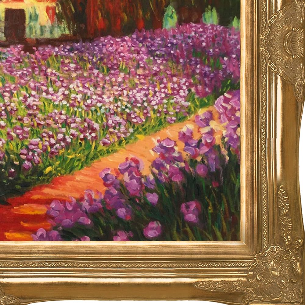 Hand painted oil reproduction of a famous Monet painting, Artist's Garden at Giverny. The original masterpiece was created in 1900. Today it has been carefully recreated detail-by-detail, color-by-color to near perfection. Why settle for a print when you can add sophistication to your rooms with a beautiful fine gallery reproduction oil painting? Giverny sits on the banks of the River Seine. The village lies 50 miles Northwest from Paris, on the border next to the province of Normandy. Claude Monet noticed the village of Giverny while looking out the window of a train. In 1890 Monet bought a house and land in Giverny and created the magnificent gardens he wanted to paint. While Monet successfully captured life's reality in many of his works, his aim was to analyze the ever-changing nature of color and light. Known as the classic Impressionist, Monet cannot help but inspire deep admiration for his talent in those who view his work. This work of art has the same emotions and beauty as the original. Why not grace your home with this reproduced masterpiece? It is sure to bring many admirers! Frame Description: Victorian Gold Frame