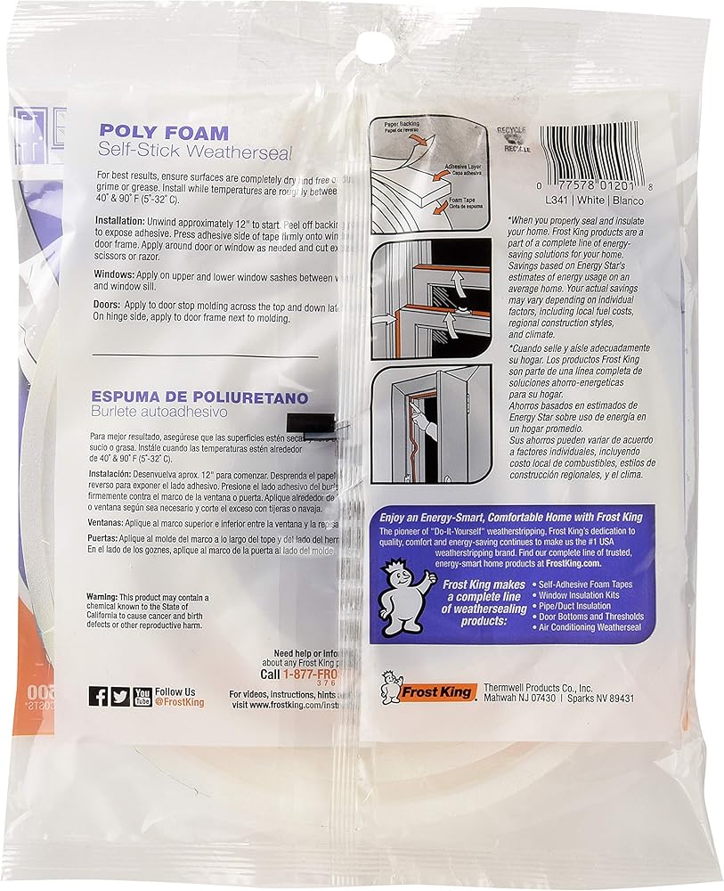 Frost King Polyurethane Foam Tape has an open cell for maximum compression. A highly compressible self-stick tape designed for interior use. The tape squeezes down to fill very narrow gaps.