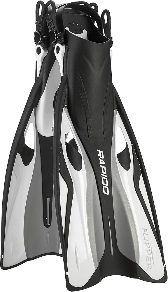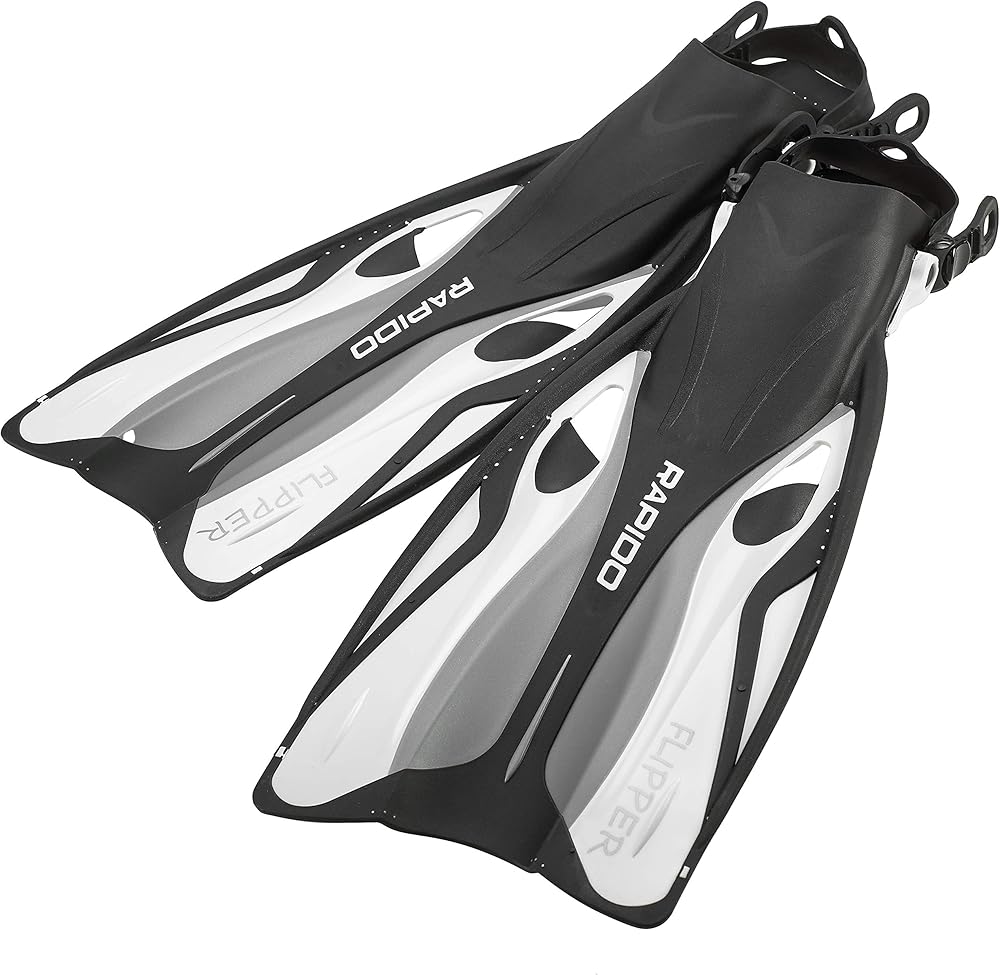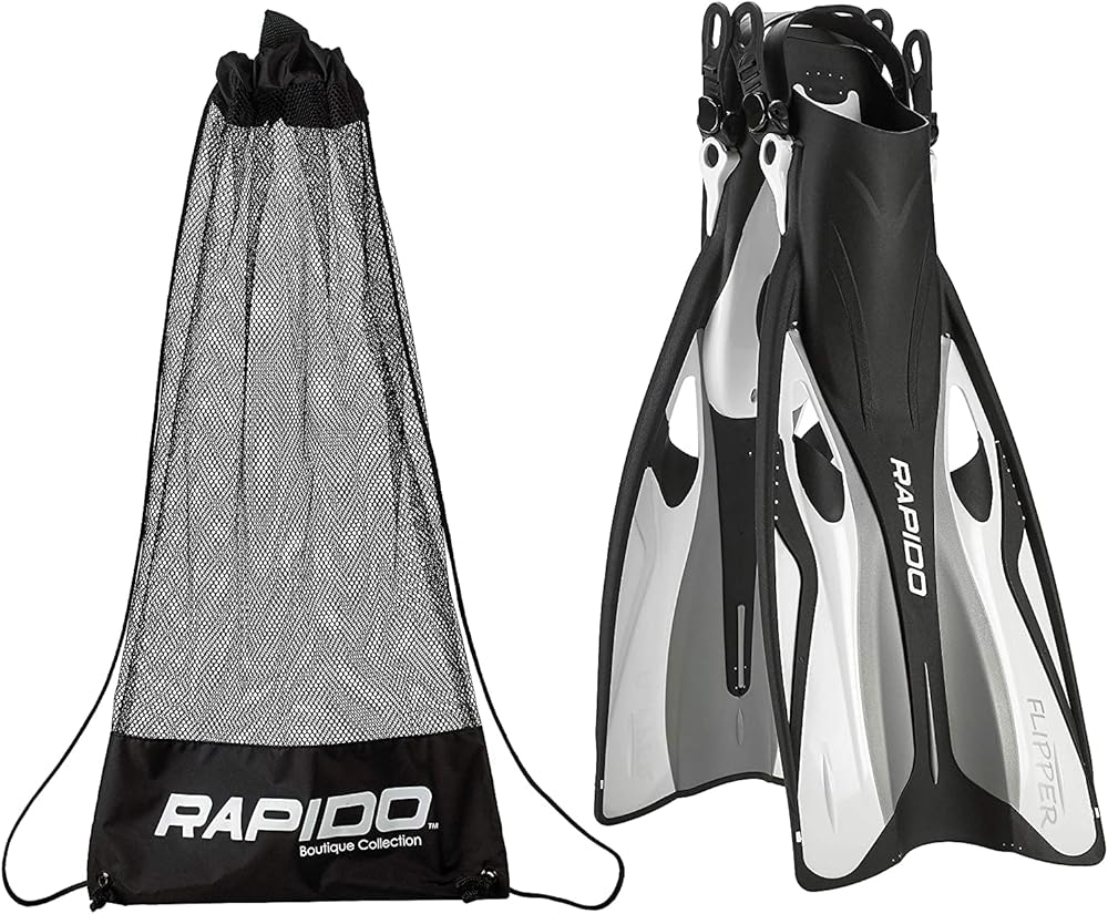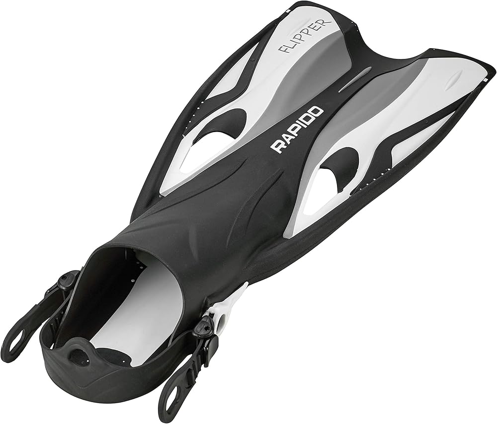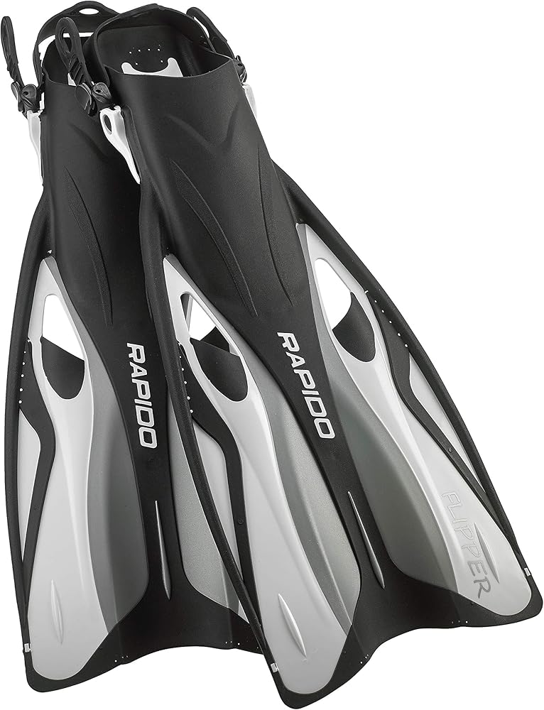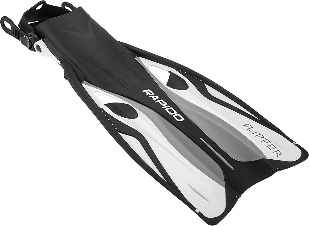 Gear up with the Rapido Boutique Collection Flipper Open Heel Adjustable Fin, Excellent for snorkeling and ideal for leg workouts in the pool. Experience power and performance with the Rapido Flipper Fins. Designed for adults, these snorkel fins boast a patented, detached foot pocket to help reduce leg cramping, unnecessary stain and fatigue. You'll love the Flipper technology's full power and performance when you sport these Rapido fins all season long. Key Features: Extended sole plate adds thrust, Simple strap adjustment system, Designed for maximum comfort, Durable and offers long lasting performance. Flexible Center Channel Accelerates Water Over The Blade For Improved Efficiency, Reduces the stress on while accelerating the water over the blade, Great flexibility, Long-lasting, Light-weight and wear-resistant, Quick release, Quick - adjust buckle makes adjusting a snap. Super Ergonomic Open Heel Foot Pocket Design: The Flipper fin has an extended sole plate, which adds thrust and relieves strain on your foot. Built with a simple and reliable strap adjustment system for ease of donning and doffing. A contoured foot pocket design gives maximum comfort . . .