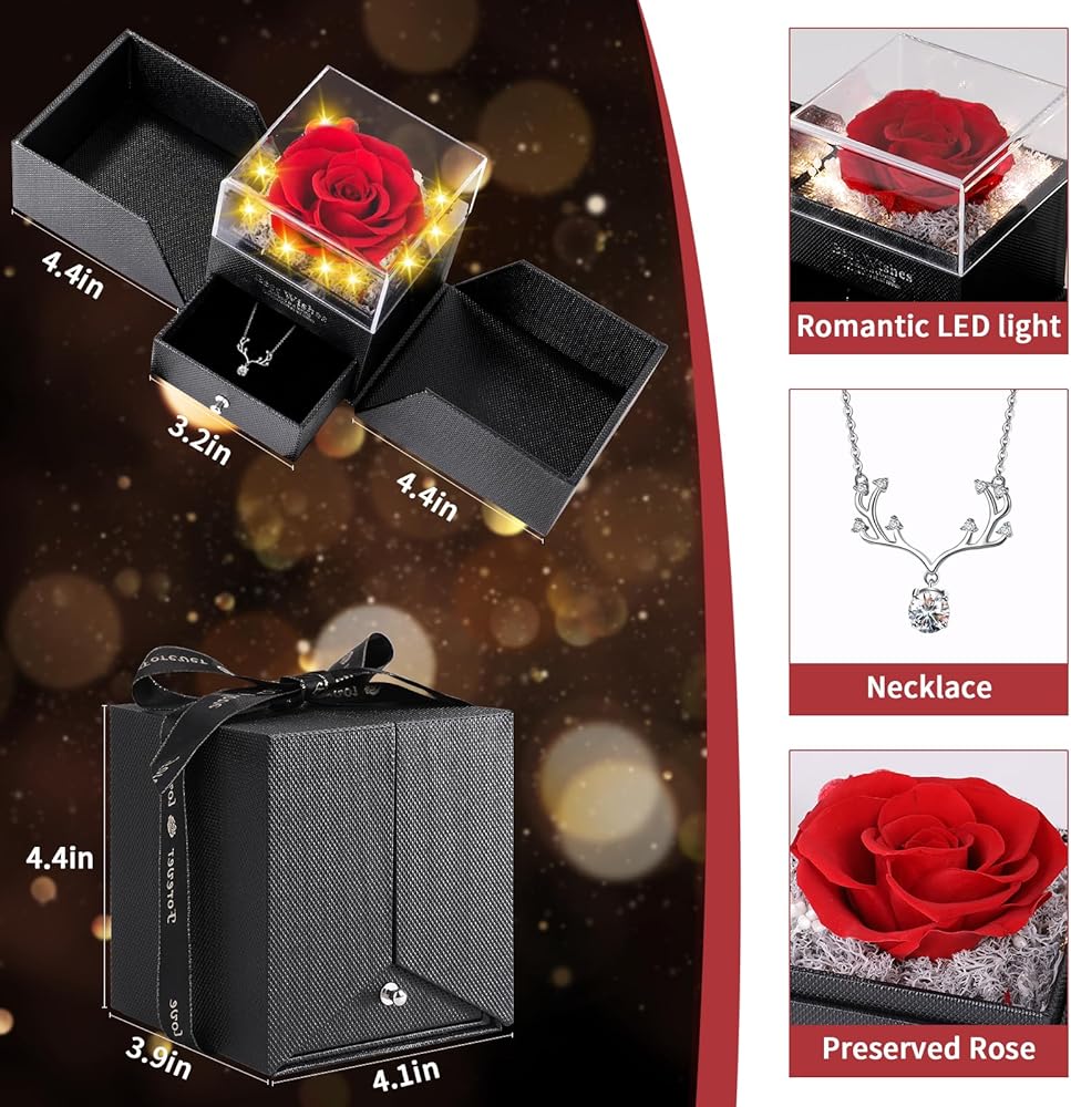 【صندوق هدايا الورد المحفوظ الأنيق】 داخل صندوق هدايا الورد المحفوظ بأناقة هذا، ستجد وردة حمراء مبهجة مقترنة بقلادة ساحرة. عند فتحها، من المؤكد أن الوردة الحمراء الرائعة ستأسر قلبها.
